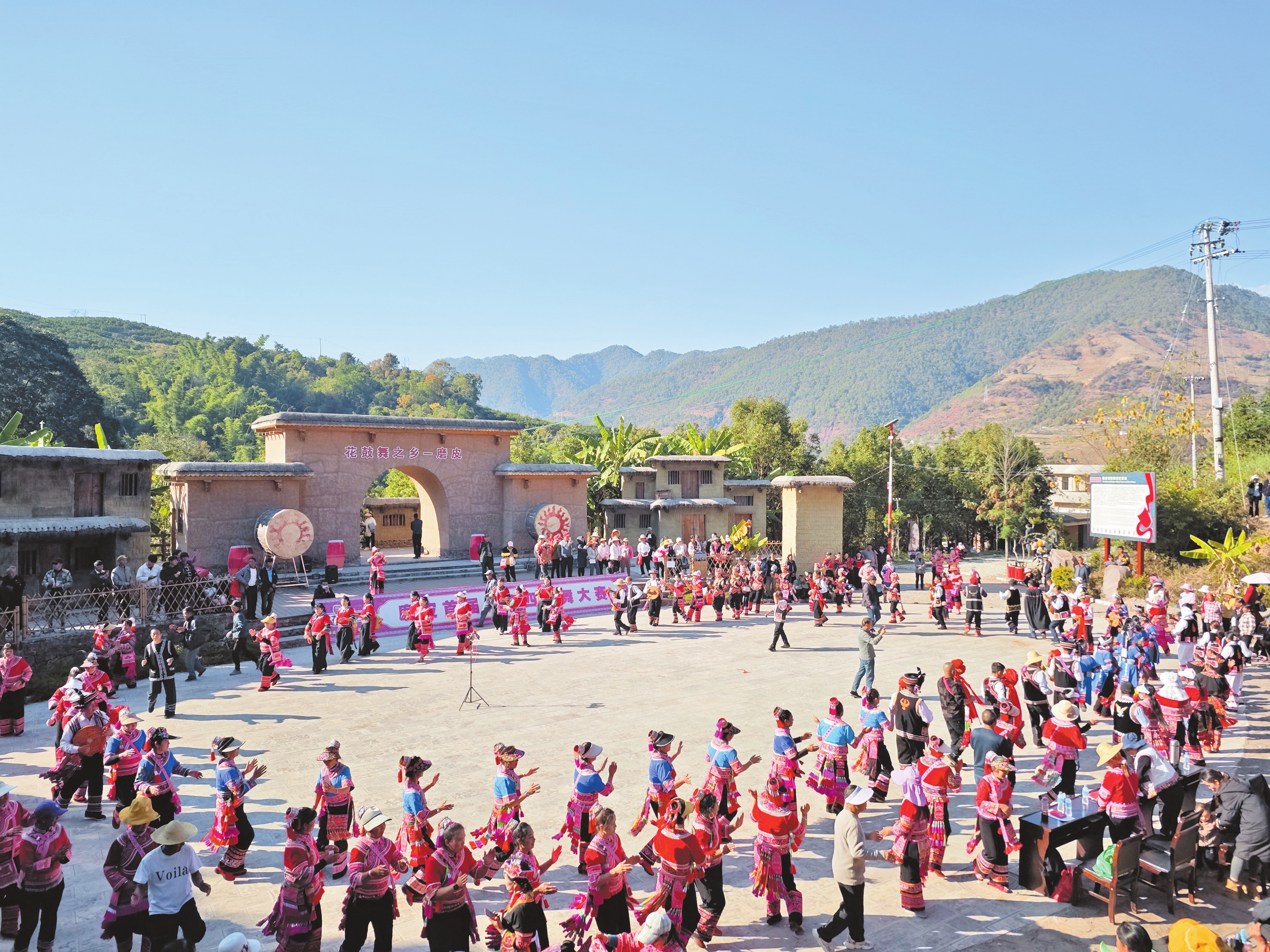 黄墙灰顶的彝族民居,质朴的花鼓舞文化广场,鼓乐喧天,欢歌热舞。每逢周末都会有不少游客来到新平彝族傣族自治县平甸乡磨皮村。“现在的磨皮村,每个周末都是节日、赶集日。”磨皮村党总支书记、村委会主任魏正荣说,这得益于村里的两个省级非物质文化遗产——磨皮花鼓舞、彝族吃花酒。