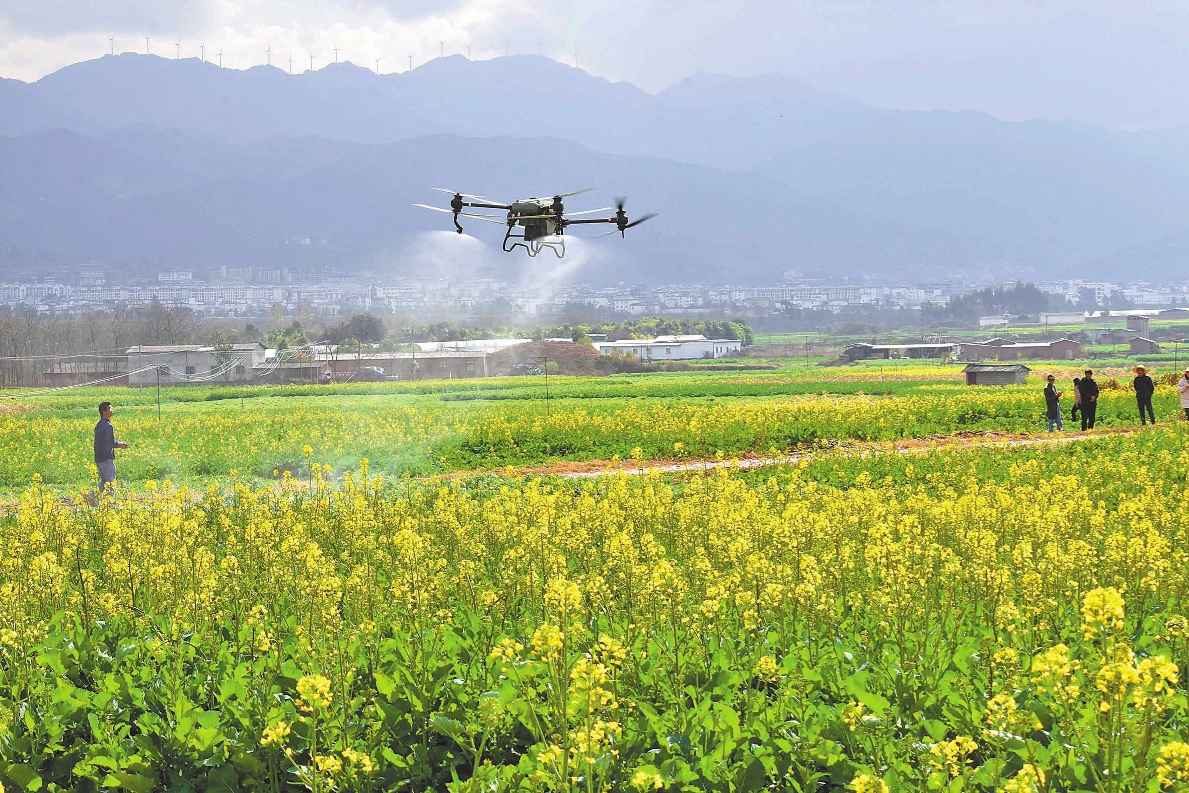近日,在巍山彝族回族自治县庙街镇新云村的500亩油菜核心示范区,县农业农村局农技站组织技术人员正在进行无人机统防统治作业。1月以来,巍山县2.61万亩油菜花陆续绽放,油菜进入中耕管理关键期,当地农技人员纷纷走进田间地头,指导农民加强病虫害防治等田间管理,确保油菜实现增产增收。 本报通讯员 张树禄 官崇圭 摄