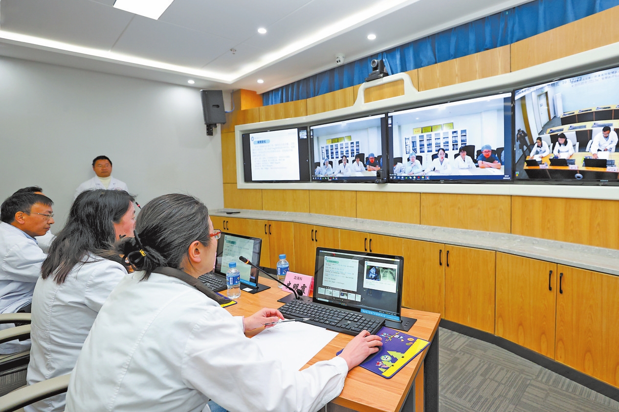 昆明医科大学第一附属医院智慧医疗中心值班医务工作者进行远程会诊。