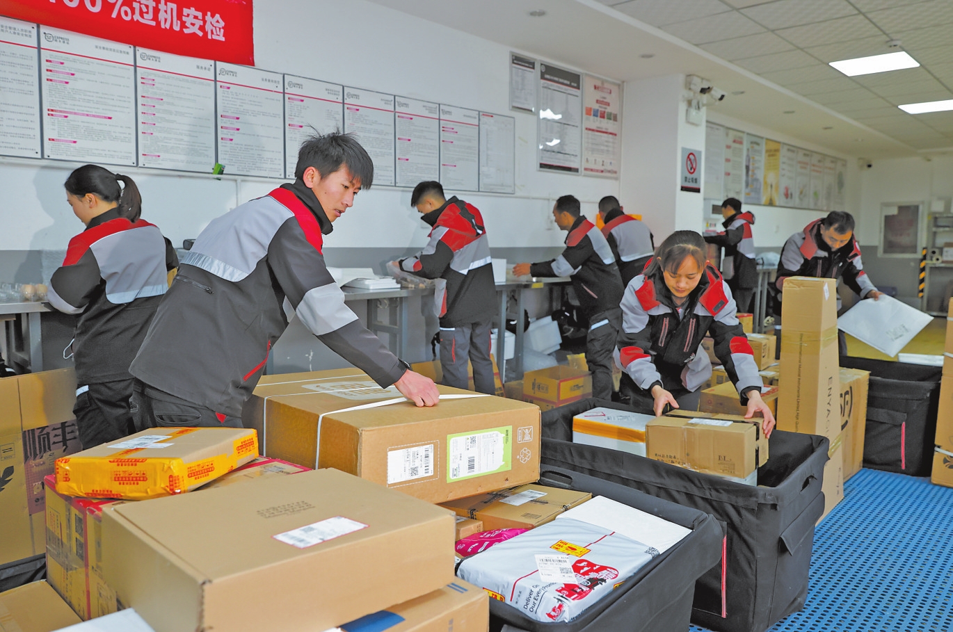云南顺丰速运公司昆明百集龙营业点快递配送人员为快递打包。
