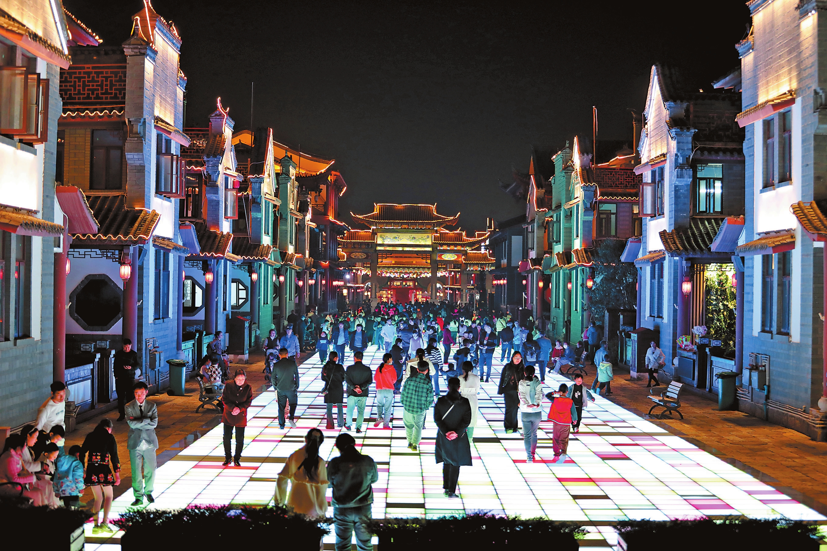 春节期间,蒙自市过桥米线小镇夜市灯光璀璨、人流如织,热闹非凡。众多市民和游客逛夜市、品美食、赏美景,享受缤纷夜生活。活力迸发的夜经济,让蒙自市的夜晚“亮”起来、消费“火”起来。本报记者 饶勇 通讯员 王俞 摄