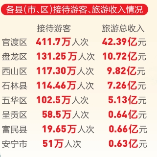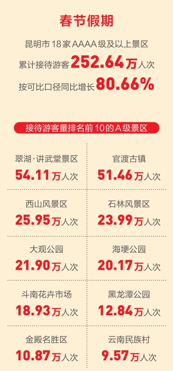 今年春节假期,昆明市凭借一系列丰富多彩的文化活动和贴心周到的服务保障,强劲圈粉,打造了一场“热辣滚烫”的文旅盛宴。数据显示,春节假期,昆明市共接待国内游客1368.41万人次,按可比口径同比增长32.93%;38个A级景区共接待游客342.66万人次,按可比口径同比增长79.73%。