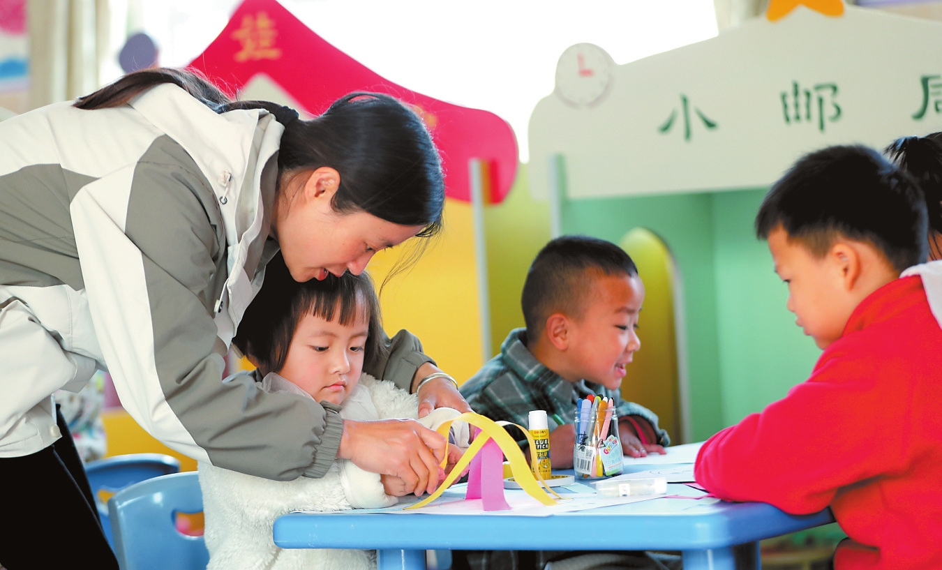 图为宜良县古城幼儿园爱心托管班的老师教幼儿做手工。
