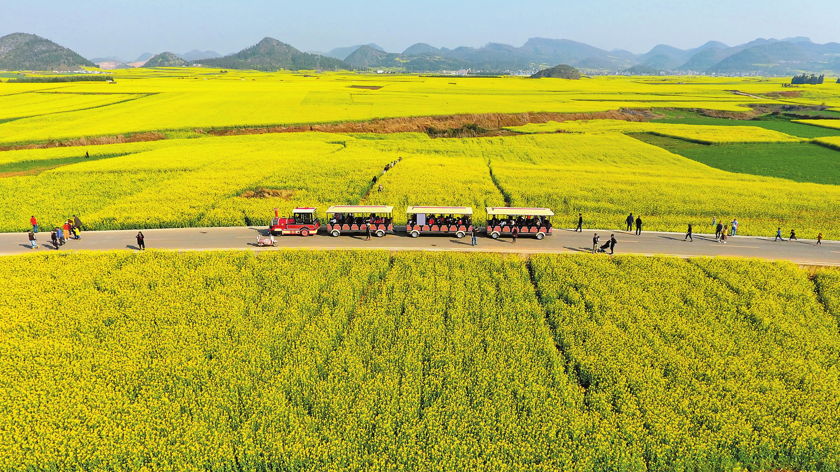 立春以来,罗平县百万亩油菜花竞相绽放。蓝天白云下,金浪翻滚、蝶舞蜂飞、清香四溢……远山近水皆被金黄色的油菜花掩映其中,美不胜收。