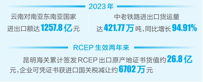 云南聚焦中国(云南)自由贸易试验区制度创新,推进《区域全面经济伙伴关系协定》(RCEP)原产地规则和关税减让等政策红利落地见效。RCEP生效两年来,昆明海关累计签发RCEP出口原产地证书货值约26.8亿元,企业可凭证书获进口国关税减让约6702万元。近年来,昆明、德宏、红河、大理4个跨境电商综合试验区获批并加快建设;综合保税区飞行模拟器培训监管模式等创新举措在中国(云南)自由贸易试验区实施,助力企业降本增效。