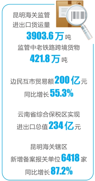 2023年,昆明海关监管进出口货运量3903.6万吨,增长32.2%,创历史新高;腾冲市口岸进出口贸易额同比增长97.2%;临沧市口岸进出口贸易额增长91.2%……云南口岸经济加快发展,经营主体活力增强。口岸成为观察云南外贸活力的重要窗口。