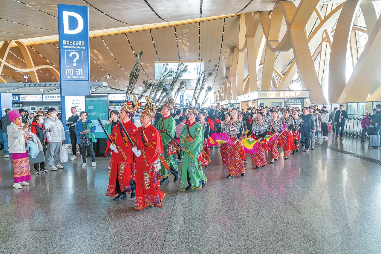 活动中,苏南瑞丽航空和昆明机场员工分别开展了暖场演出。云南省景颇族协会的演员们开始表演,旅客争相与演出队伍合影留念。