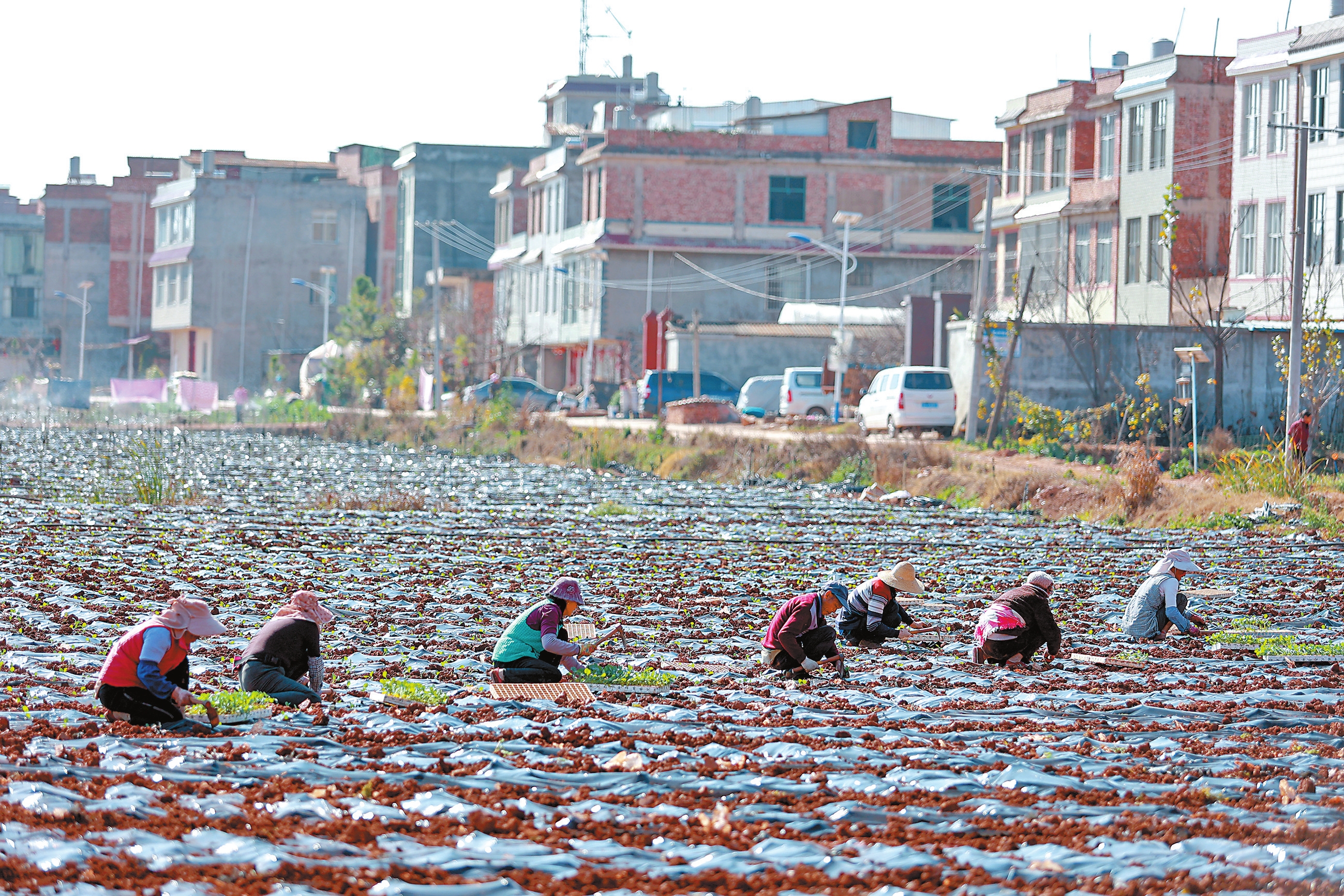 图为晋宁区村民在蔬菜基地种植农作物,堆肥、覆膜、运秧、插秧有序进行。