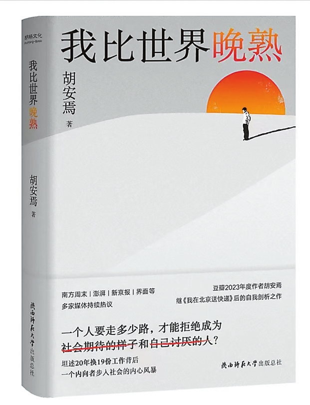 2023年,《我在北京送快递》成为现象级畅销书,该书作者胡安焉随之走进了大众视野。时隔一年,《我比世界晚熟》(陕西师范大学出版社2024年1月版)出版,这是一部非虚构的自传作品。胡安焉讲述了自己1999年中专毕业至今20多年的工作和社会经历。他先后在广州、南宁、大理、上海、北京等地从事快递员、营业员、酒店服务员等19份工作。