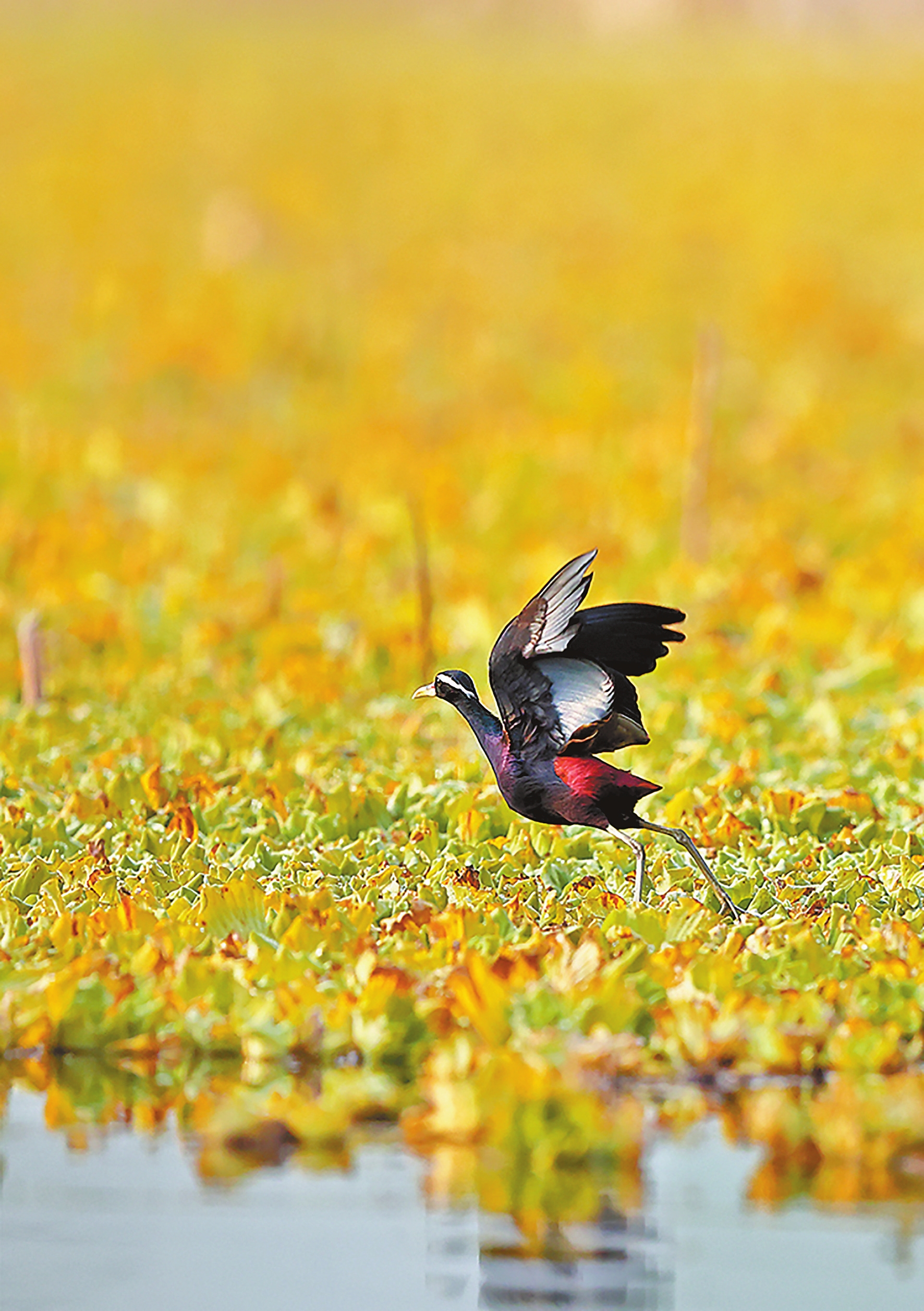 铜翅水雉分布在亚洲南部的热带和亚热带地区,为我国二级重点保护野生动物。经确认,香额湖景区发现的这只铜翅水雉,为我国境内目前唯一能观察、记录到的铜翅水雉。