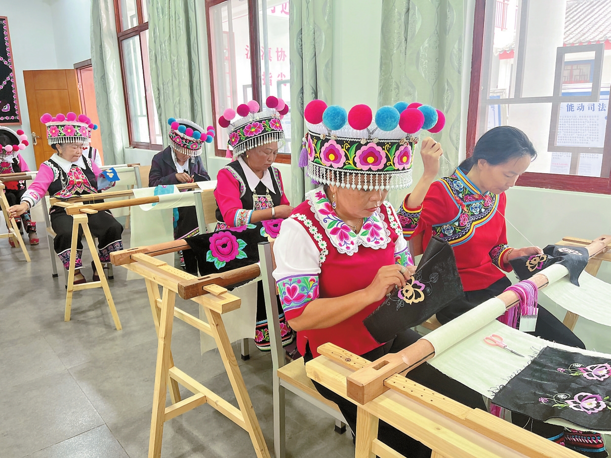 在楚雄彝族自治州,像金瑞瑞、黄永兰一样依靠彝绣技艺成功创业、就业的绣娘越来越多,这得益于楚雄州对彝绣这项有着1700多年历史的国家级非遗项目的活化传承利用。目前,全州从事彝绣产业的绣娘已达5.7万人,2022年全州彝绣产业实现增加值2.45亿元,2023年实现增加值2.75亿元,带动2000多名残疾绣娘就近就业。
