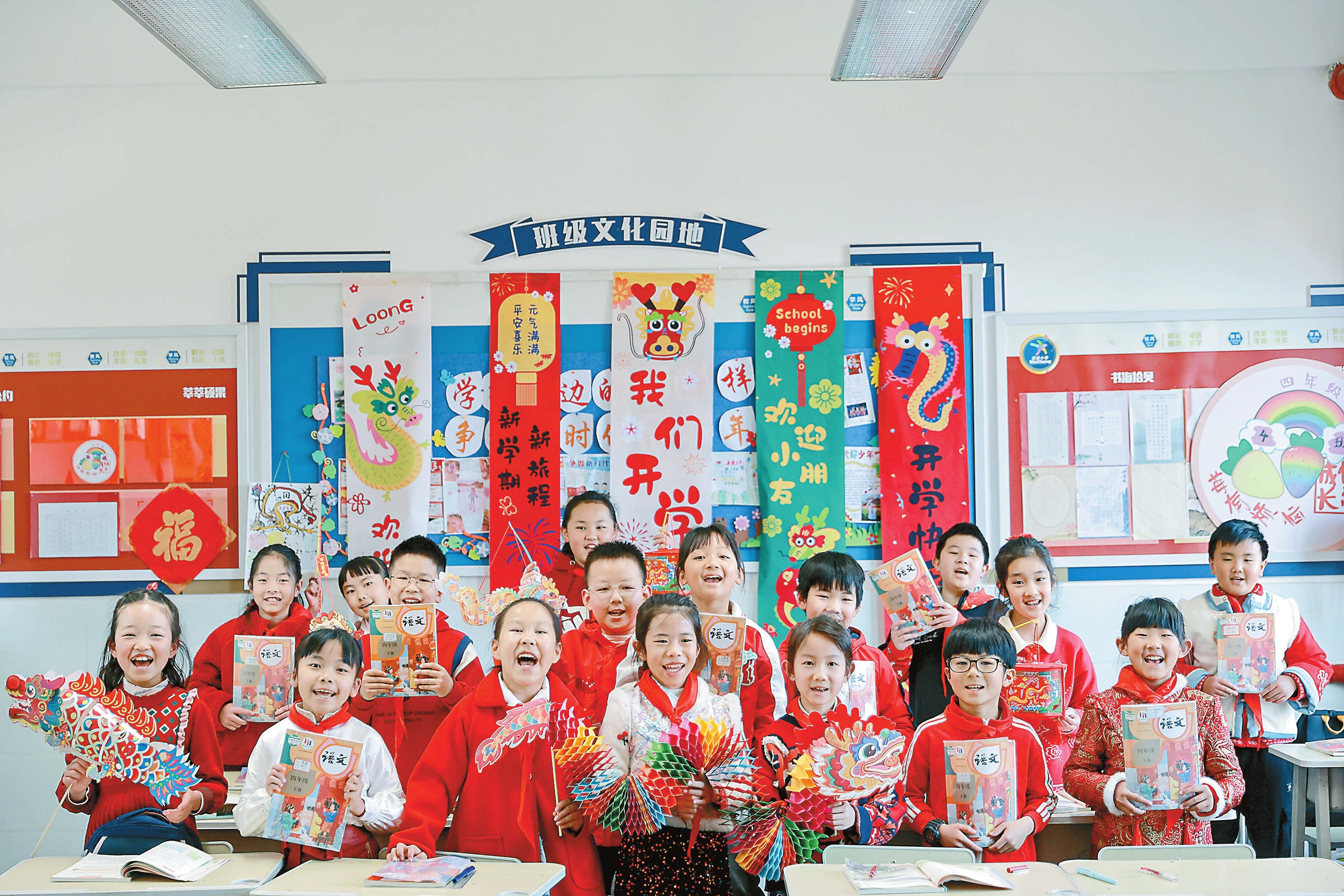 在五华区武成小学人民路校区,各个班级以龙元素与开学元素相融合的“文化园地”,营造了其乐融“龙”的欢乐氛围。师生们身着传统服饰、手持非遗饰品,共同迎接新学期的到来。开学当日,武成小学还开展了“龙马精神续百年 星火少年启新程”2024年春季开学典礼暨美育浸润行动启动仪式。