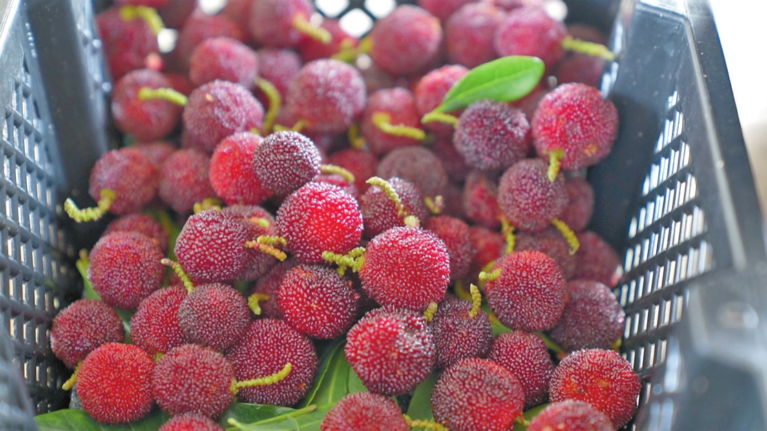 一大早,走进火柯姆冲万亩早熟杨梅基地,映入眼帘的是一排排整齐排列的杨梅树。枝叶交错间,一颗颗红宝石般的杨梅在阳光下散发着诱人的光泽,令人垂涎欲滴。果树下,村民脸上洋溢着丰收的喜悦,手中的果篮已经装得满满当当。新鲜采摘下来的杨梅经过精心挑选、分筛后,将被空运送往全国市场。