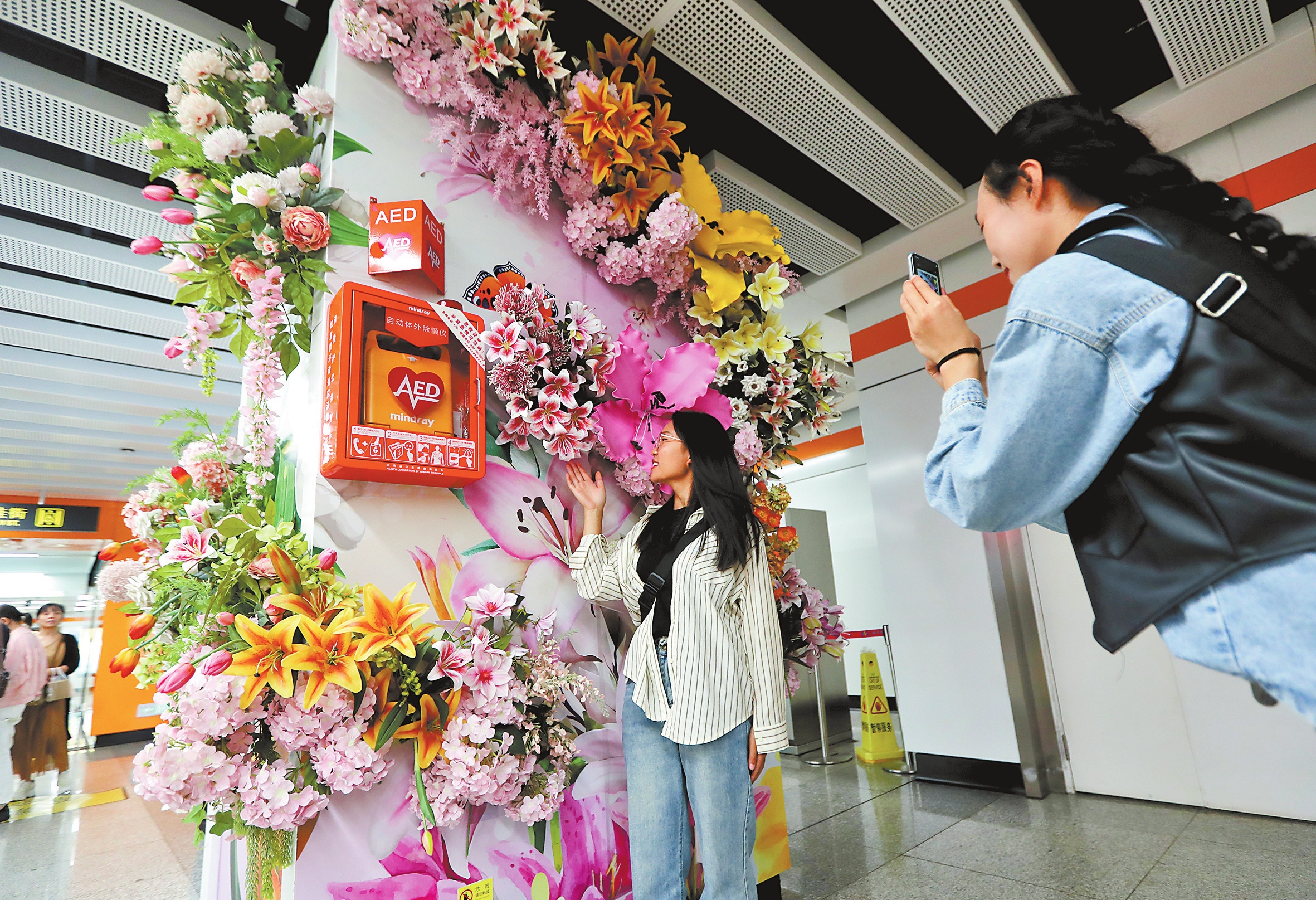 在昆明地铁四号线金桂站斗南花市进出口通道,美艳的花墙上醒目地安装了自动体外除颤器,这个标注“AED”字样的橙黄色箱体将在出现紧急情况实施心脏骤停急救时赢得挽救生命的“黄金时间”。