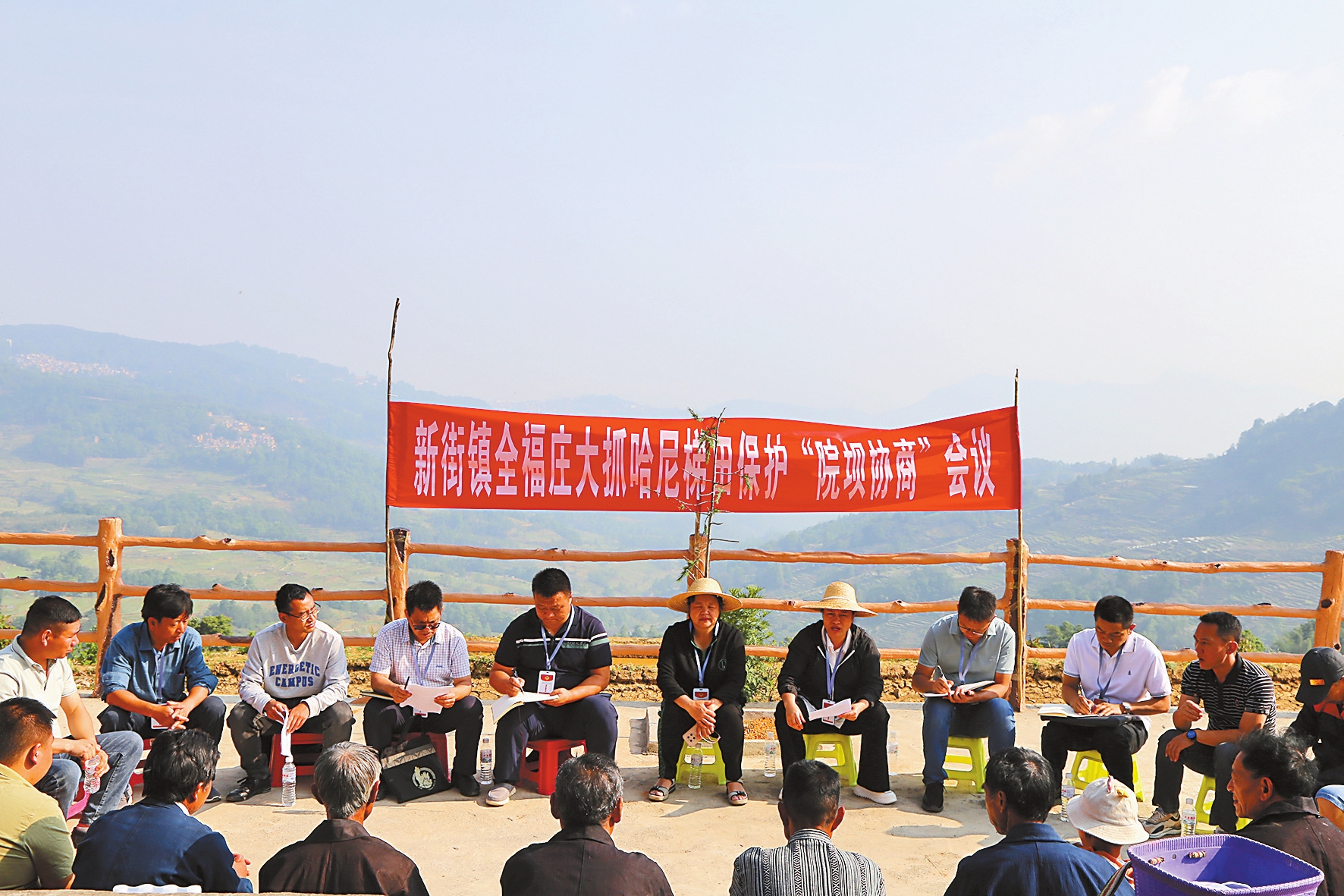 梯田边,参与人员围坐一堂。大家围绕梯田保护缺强劳动力、缺传统农耕文化、梯田缺水的问题深入进行探讨,最终协商形成了组建哈尼梯田耕种互助队,由党员干部和村寨中明白人、带头人引导农户主动投入梯田恢复工作,加快恢复推行传统木刻分水法和“赶沟人”“守林人”等共识。