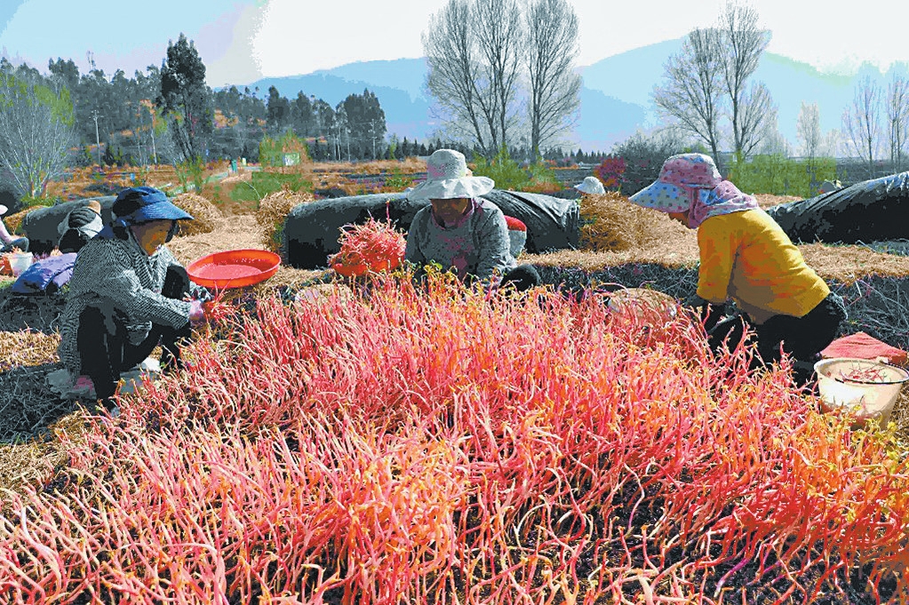 最近几天,剑川县沙溪镇新绿蔬菜种植家庭农场里,数十名村民正在忙着采割鱼腥草嫩芽。当天采摘、捆绑好的鱼腥草会被统一打包、装车,及时发往昆明、大理、丽江等地进行销售,每天销量约1吨。