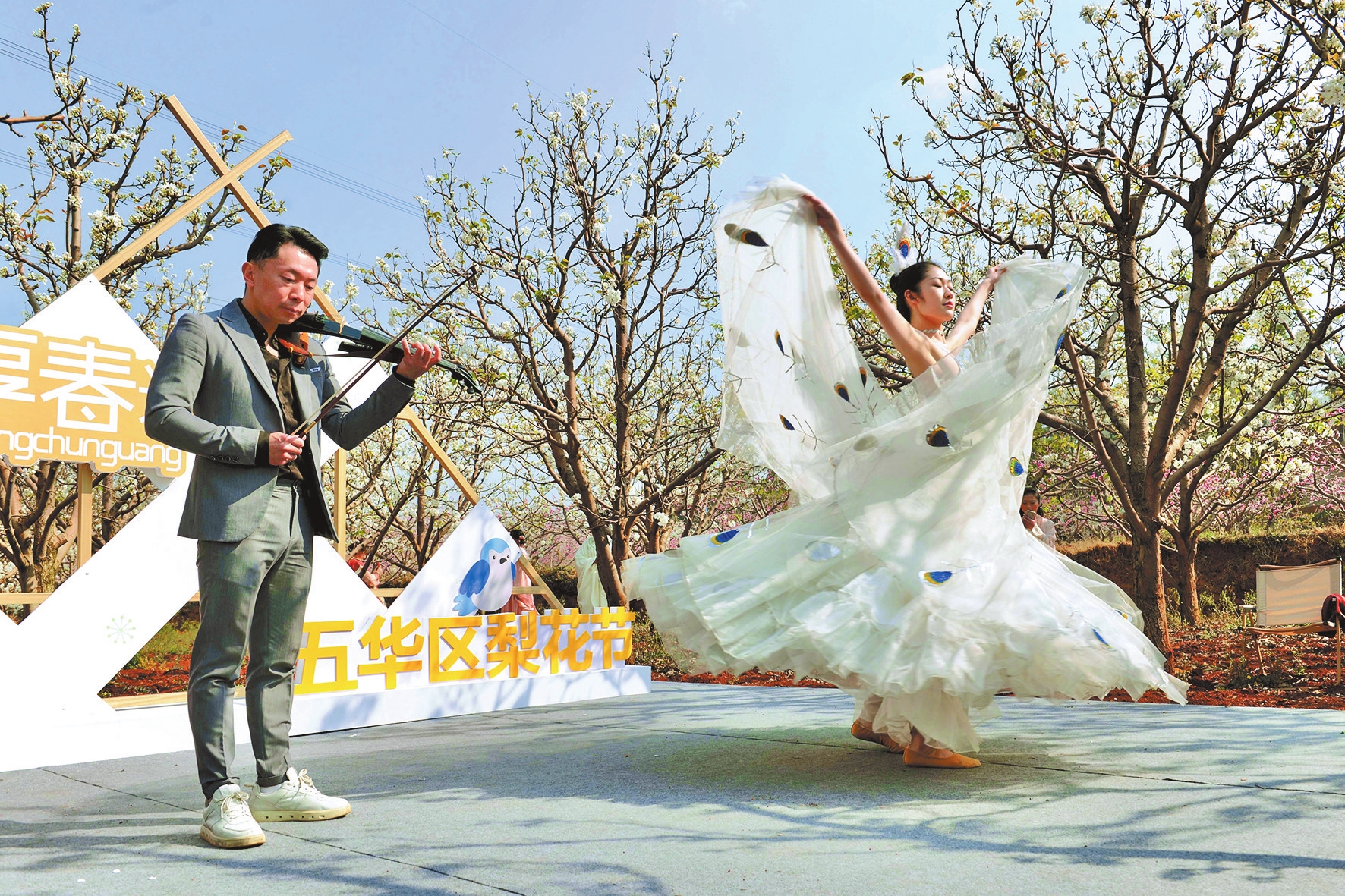 活动当天,一场精彩的演出拉开了梨花节的序幕。梨花树下,艺术家们用舞蹈讲述云南故事,传递着自然之美与孔雀舞的灵动之美;昆明聂耳交响乐团奏响悠扬的乐声,与舞者的步伐相互辉映。