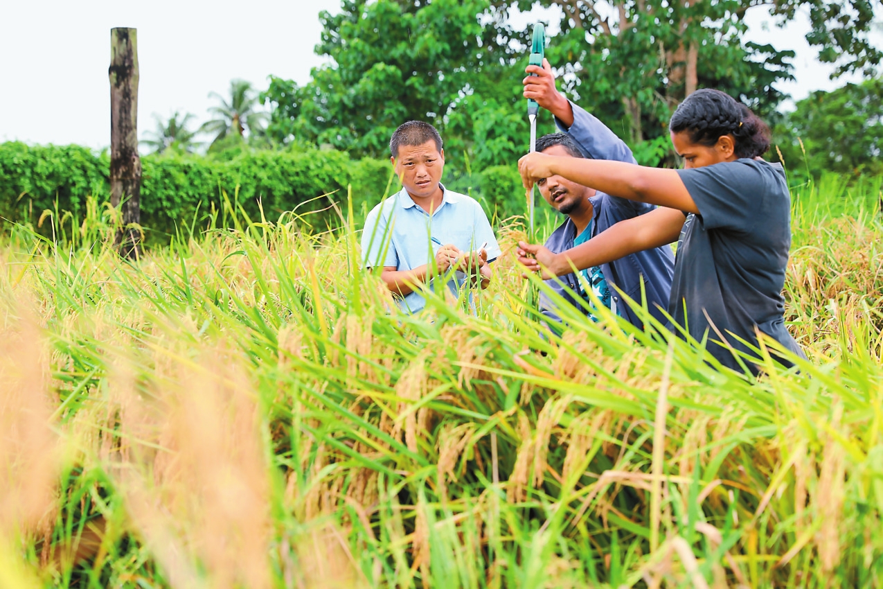 斐济政府近年来一直致力于实现大米自给自足,以确保粮食安全。然而,受耕作方式、劳动力短缺和气候变化等因素影响,该国稻米产业面临挑战。中国先后实施了三期农业援助项目,通过技术培训、引进新品种、建立标准化稻田和推广高产栽培技术等方式帮助斐济提高水稻产量。图为3月13日,中国育种专家吴明奎(左)在斐济瑙索里镇的中国援斐济农业发展技术水稻项目试验示范培训基地测量水稻产量。 新华社发 桑钦龙 摄