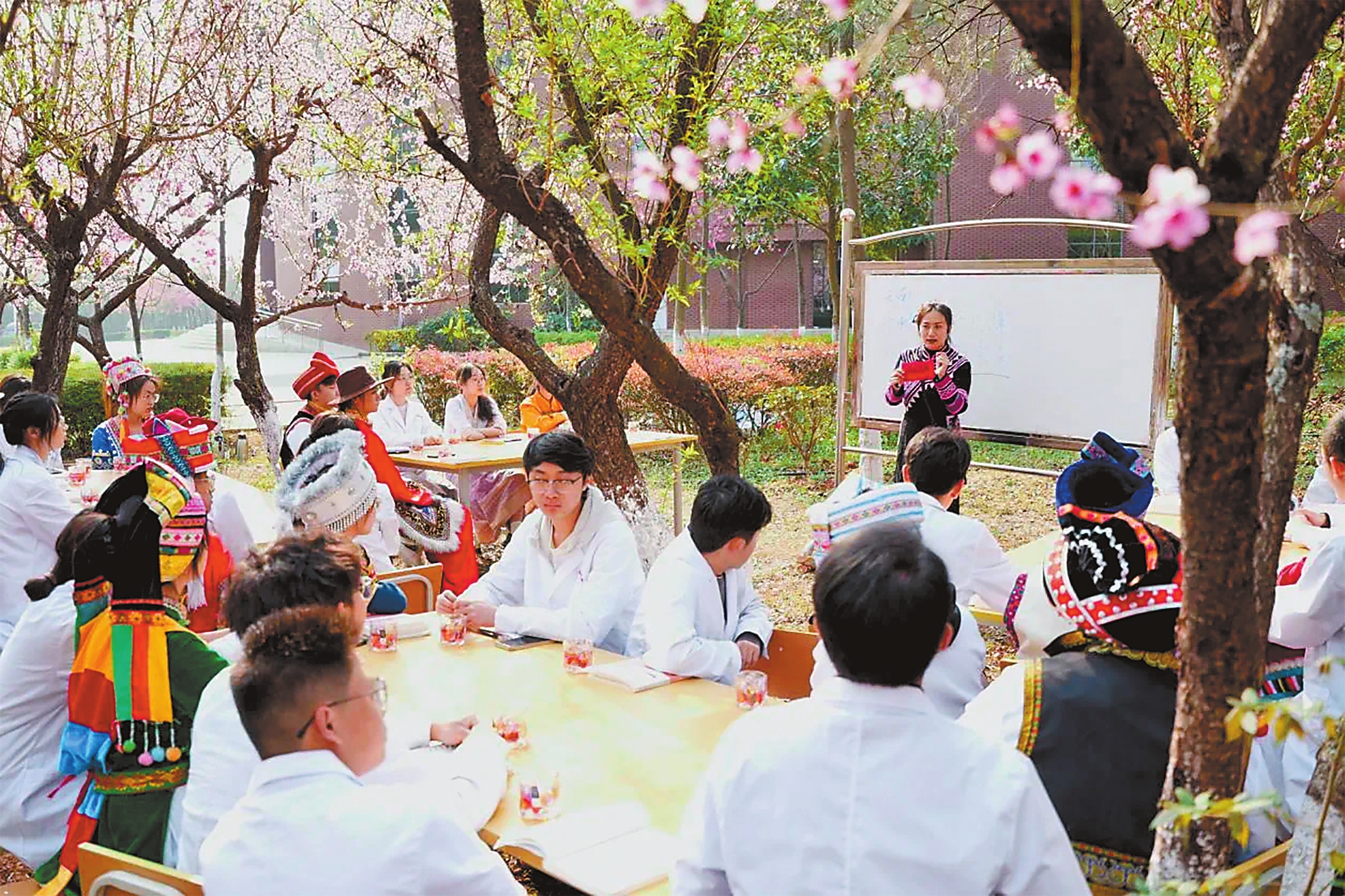 仲春和煦,昆明医科大学海源学院校园内各色花木竞相绽放。近日,该校马克思主义学院将课堂设到繁花里,与学院师生在桃花树下开展了一堂别开生面的思政课。