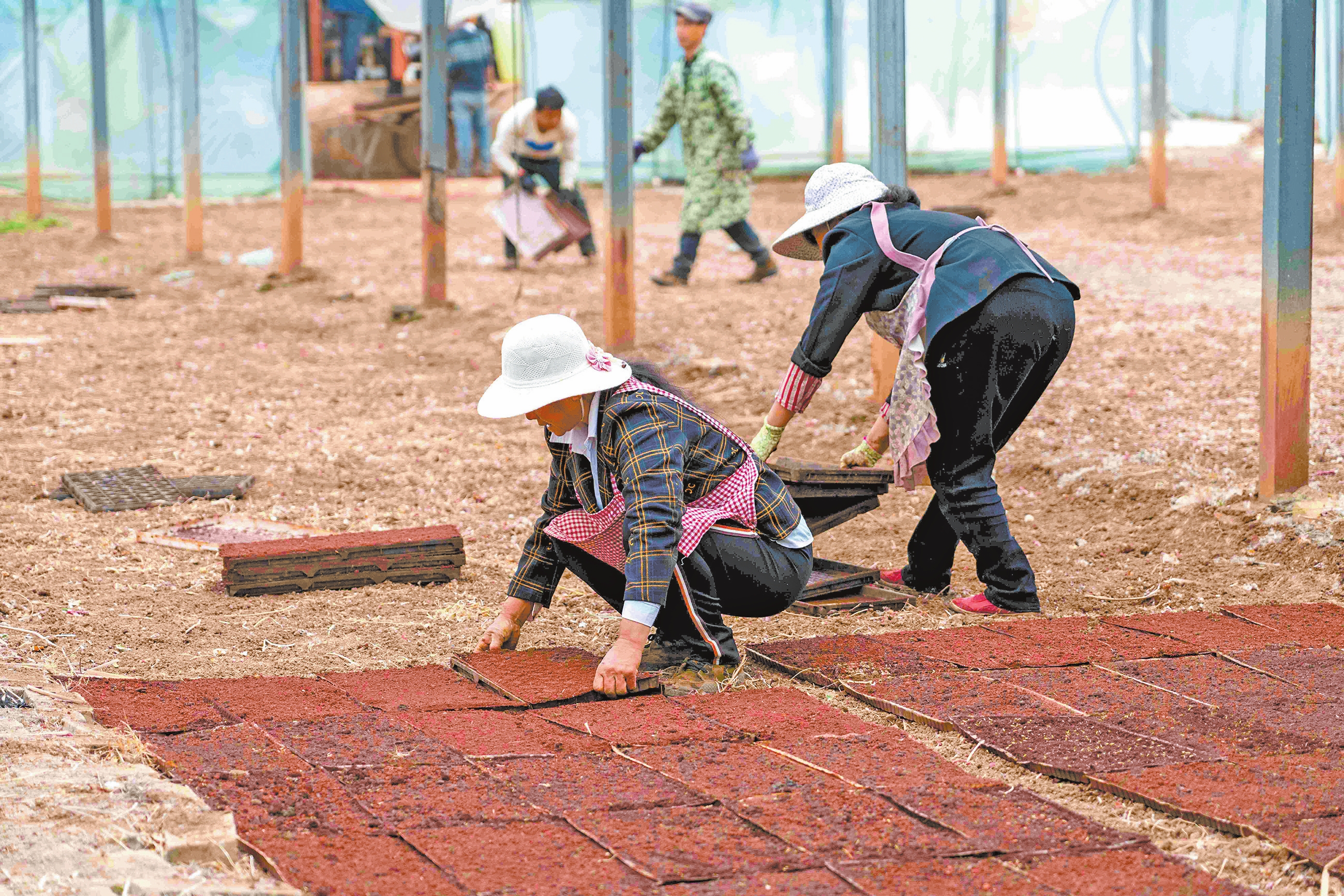 在草坝镇前进村机械化育秧基地,经过铺土、浇水、撒种、盖土等一系列工序后,育秧盘被送入温室大棚。为挖掘和探索高产潜力,蒙自市超级杂交水稻高产攻关试验示范项目工作采用“工厂机械化育秧+机械化移栽+人工精确定量栽培”模式推进。今年计划育秧3000多盘,品种为袁隆平超级杂交水稻新品“卓两优1126”和“粒两优8022”,将供给超级杂交水稻个旧示范基地和超级杂交水稻蒙自示范基地共200亩大田移栽使用,移栽工作预计4月20日进行。