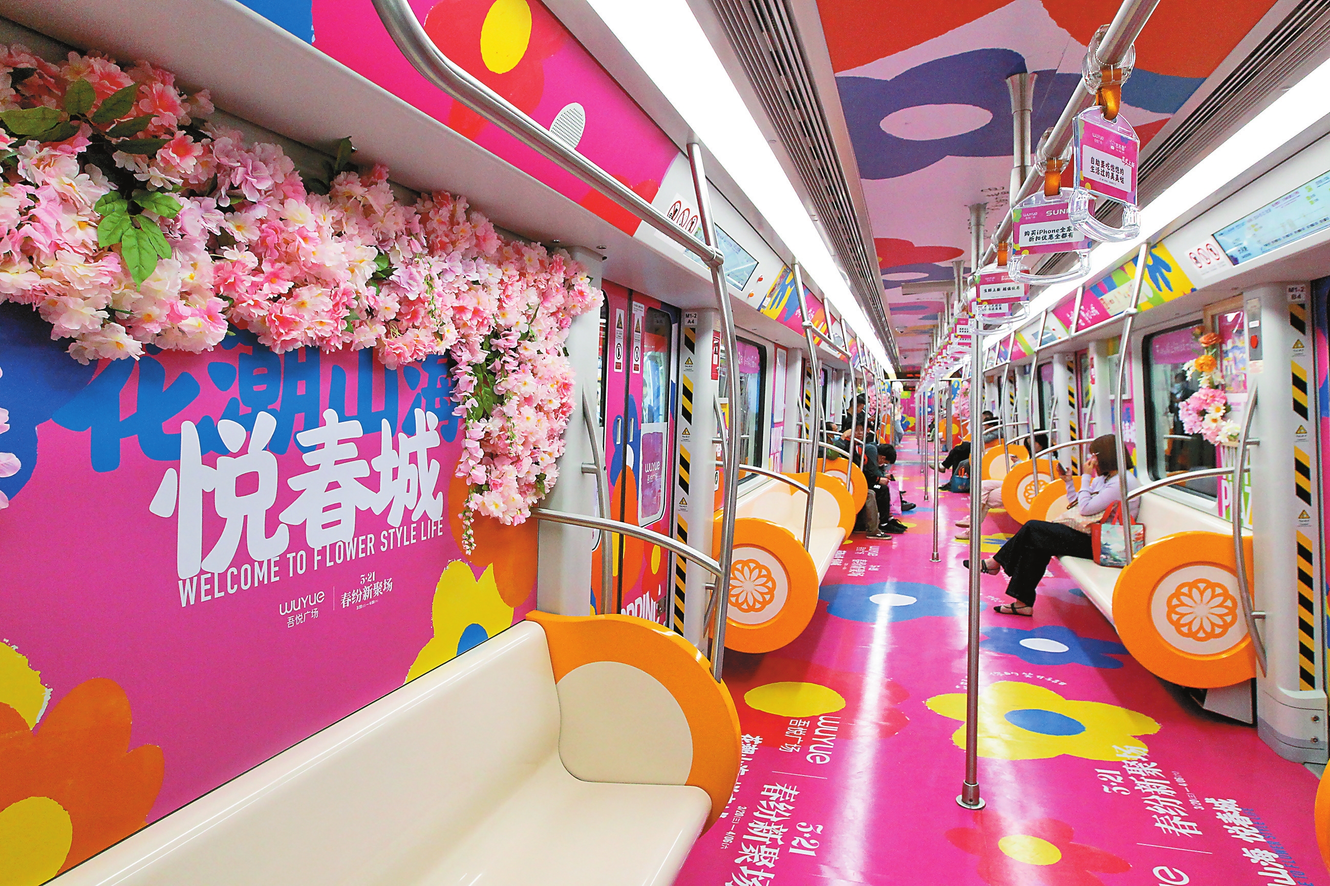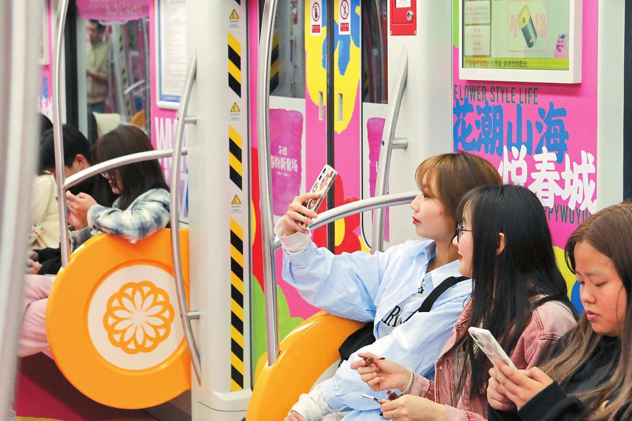 日前,昆明地铁4号线上新一列春日主题列车,车厢内用特色仿真花装饰,营造出浓厚的春日氛围,让市民和游客感受到“春城无处不飞花”的浪漫。