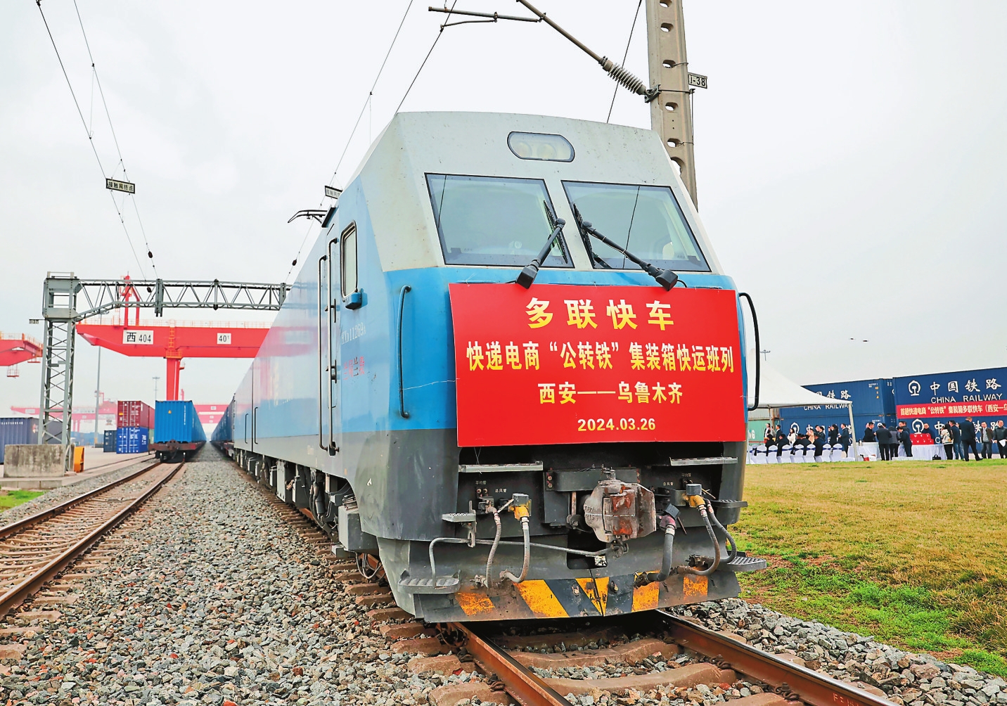 3月26日上午,满载快递电商货物的X387次集装箱多联快车从西安国际港站发车,驶往乌鲁木齐三坪站,标志着多联快车(西安—乌鲁木齐)快递电商班列正式开行。这是全国开行的首趟快递电商“公转铁”集装箱多联快车班列,为优化运输结构,有效降低社会物流成本,服务国内快递电商类货物运输开辟了新通道。图为3月26日,X387次快递电商“公转铁”集装箱多联快车在西安国际港站等待发车。 新华社记者 李一博 摄