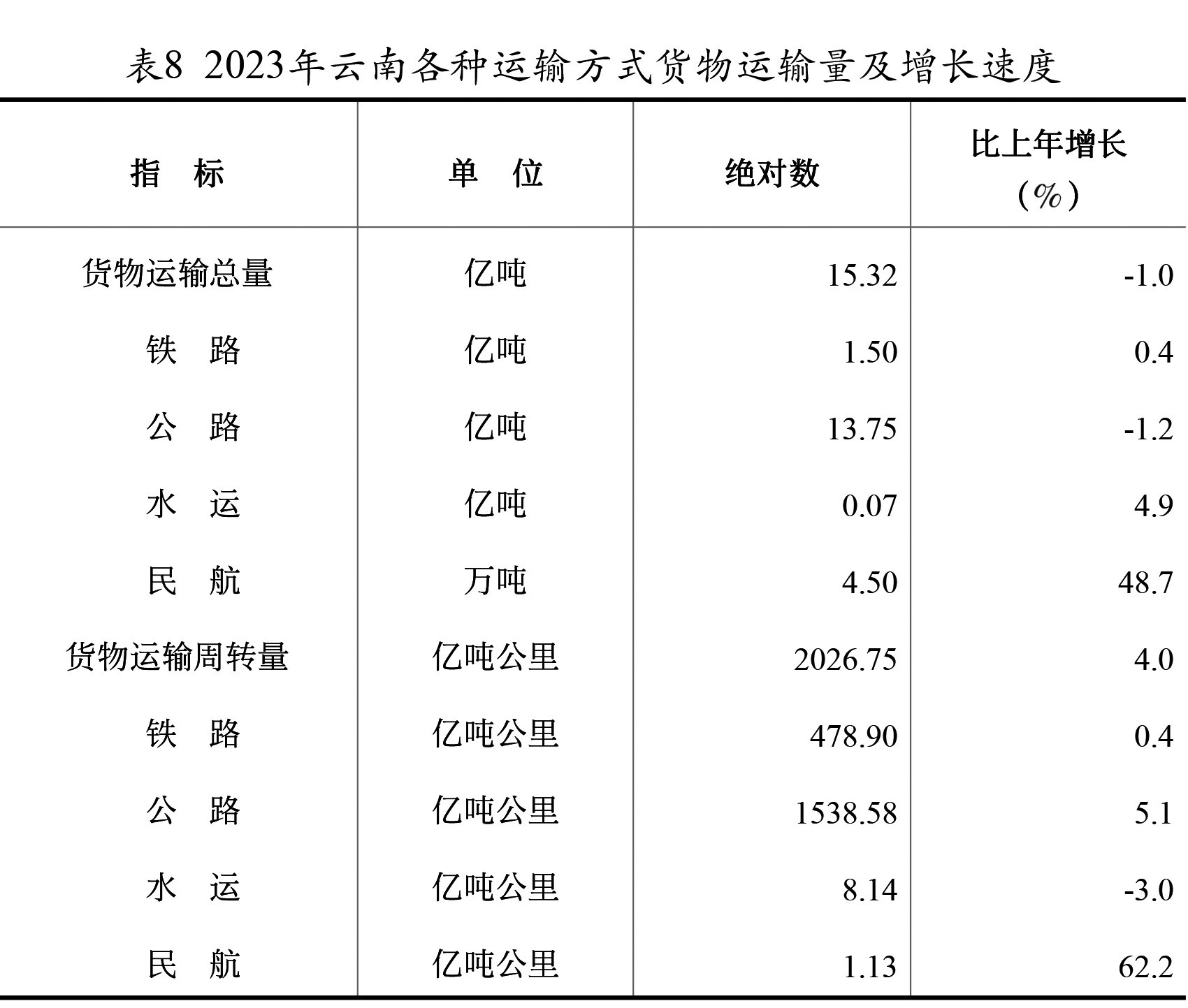 全年货物运输总量15.32亿吨,比上年下降1.0%。货物运输周转量2026.75亿吨公里,增长4.0%。