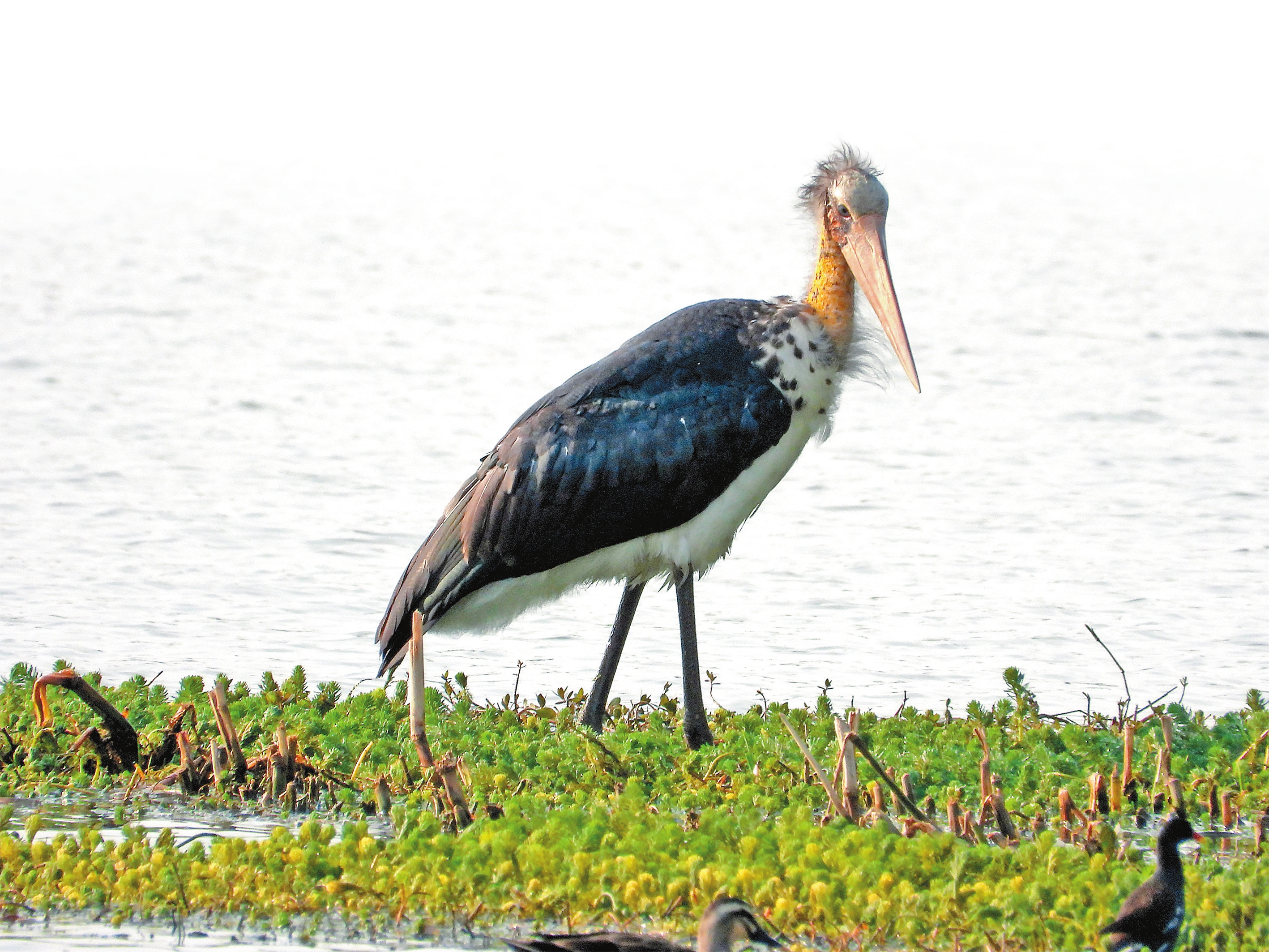 秃鹳为鹳形目鹳科鸟类,与钳嘴鹳同科,但其体型十分高大,有1.1米,较钳嘴鹳(0.8米左右)更大。秃鹳是鹳鸟中形态最奇特的鸟种,头颈裸露,背以稀疏且短的褐灰色绒羽,两翼、背及尾黑色,下半身白色,主要分布于南亚和东南亚,被世界自然保护联盟红色名录列为易危物种,为国家二级重点保护野生鸟类,在我国并无稳定常见的种群,多为偶见的单只个体,曾记录于江西、重庆、云南和海南。近年来,我省先后在洱源、拉市海和纳帕海等地记录到秃鹳。