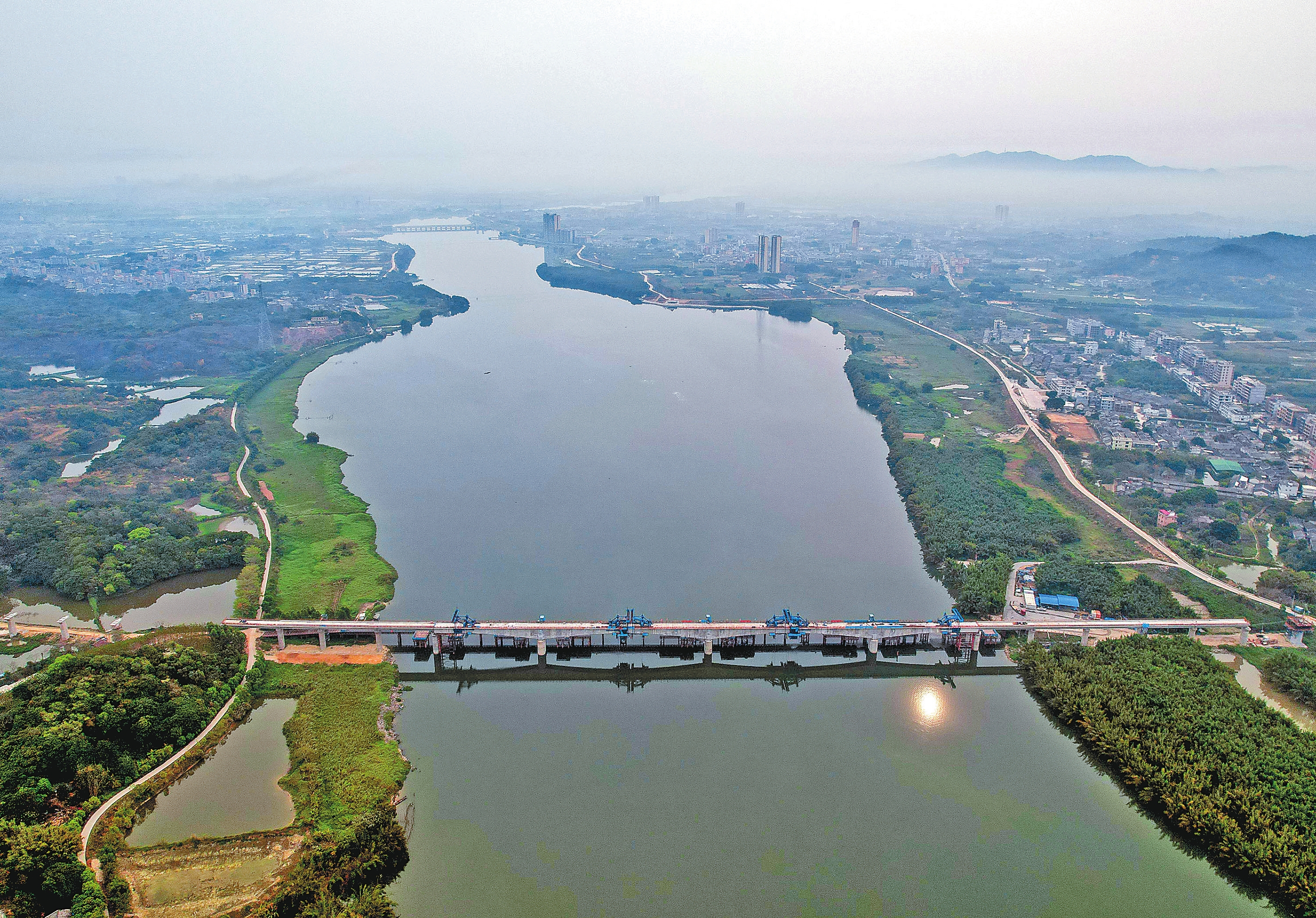 图为3月29日,揭惠铁路榕江南河特大桥主跨连续梁合龙。