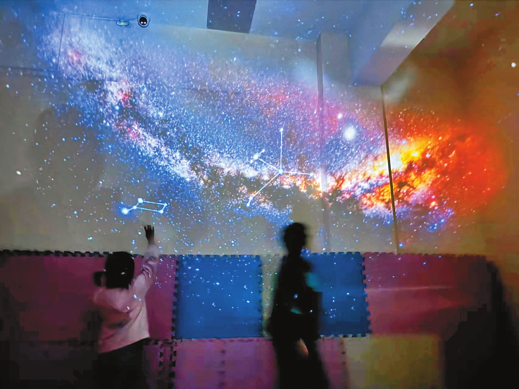 活动现场,通过3D投影技术,昆明摄影家协会星空摄影专业委员会会员们投稿的30余幅星空摄影照片被投射在教室的四面墙上,垂直延伸的银河铺展在画面正中,亿万颗繁星组成的光带将暗夜描绘得壮阔而浪漫,仅占全图不到八分之一的正下方地面,两个背影共同提着一盏油灯,面对星空。该委员会相关负责人介绍:“该作品名为‘璀璨星空照亮未来’,希望在各级党委、政府及社会各界的关心和支持下,患自闭症的儿童的未来更加光明。”