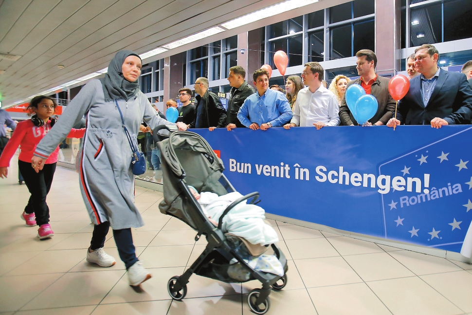 3月31日,在罗马尼亚首都布加勒斯特附近的亨利·科安达国际机场,旅客走过一处写有“欢迎加入申根”标语的牌子。自3月31日起,罗马尼亚和保加利亚与申根区其他国家之间的欧盟内部空中和海上边境将不再对出入境人员进行检查。新华社发
