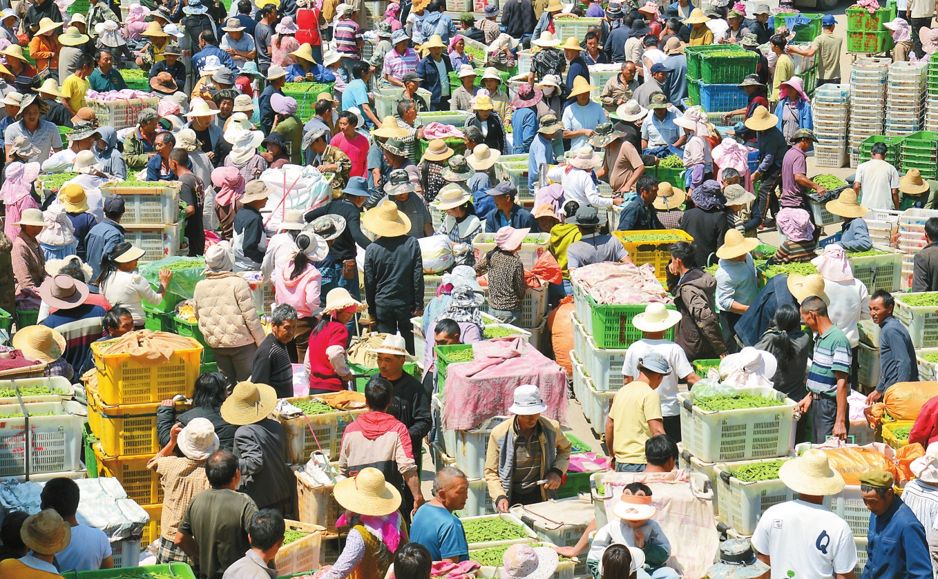 眼下正值荷兰豆集中上市季节。在昆明市晋宁区六街镇大庄村荷兰豆交易市场,经过现场分拣和采购分销的荷兰豆被及时运往北京、上海、广州、深圳等城市。目前,该市场日交易量约100吨,收购均价每公斤8至9元,日交易额80万元至90万元。