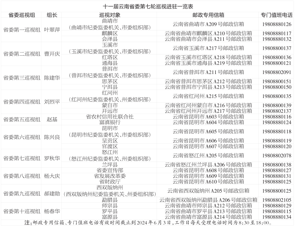 省委巡视组将在相关被巡视单位工作2个月左右。巡视期间设专门值班电话、邮政专用信箱,主要受理反映被巡视党组织领导班子及其成员,下一级党组织主要负责人和重点岗位人员问题的来信来电来访,重点是违反政治纪律、组织纪律、廉洁纪律、群众纪律、工作纪律和生活纪律等方面问题反映。其他不属于巡视受理范围的信访问题,将按规定由被巡视单位和有关部门认真处理。省委巡视组受理信访时间截止到2024年6月3日。云巡轩