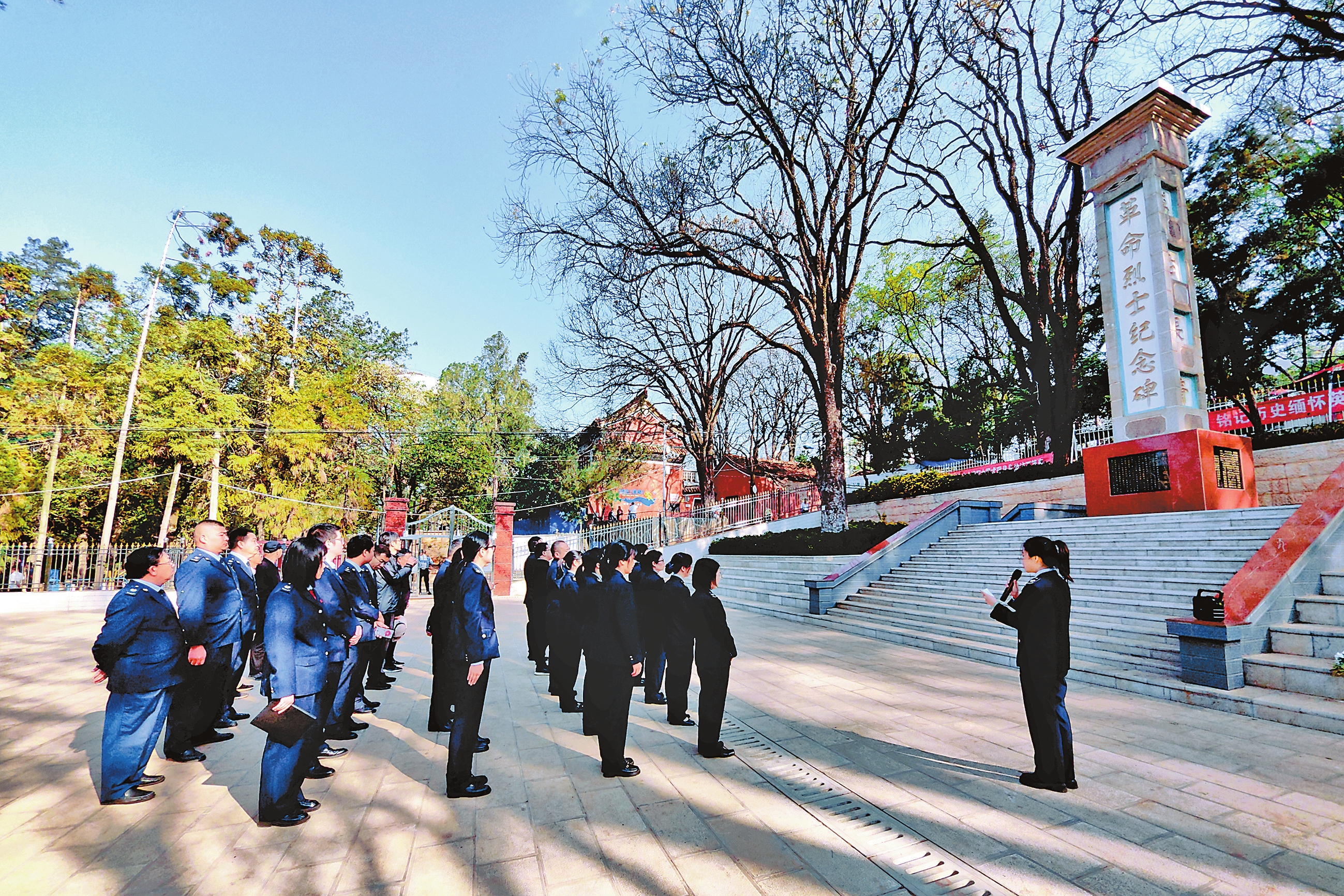 先辈回眸应笑慰,擎旗自有后来人。“我志愿加入中国共产党,拥护党的纲领……”铿锵有力的宣誓久久回荡。自4月1日以来,昆明铁路公安处各党支部组织民警参观革命遗址、烈士陵园、红色教育基地,深情缅怀革命先烈丰功伟绩。昆明铁路公安处昆明所、曲靖所、大理所民警认真学习习近平总书记给中国人民公安大学在读英烈子女的重要回信精神,昆明南所、宣威所、广通所民警集中观看红色电影,昆东所、丽江所、永仁所邀请英模、优秀共产党员代表为民警讲授专题微党课。大家一致表示,将以公安英烈的英雄事迹为榜样,把对英烈的深切缅怀化为忠诚履职的不竭动力。