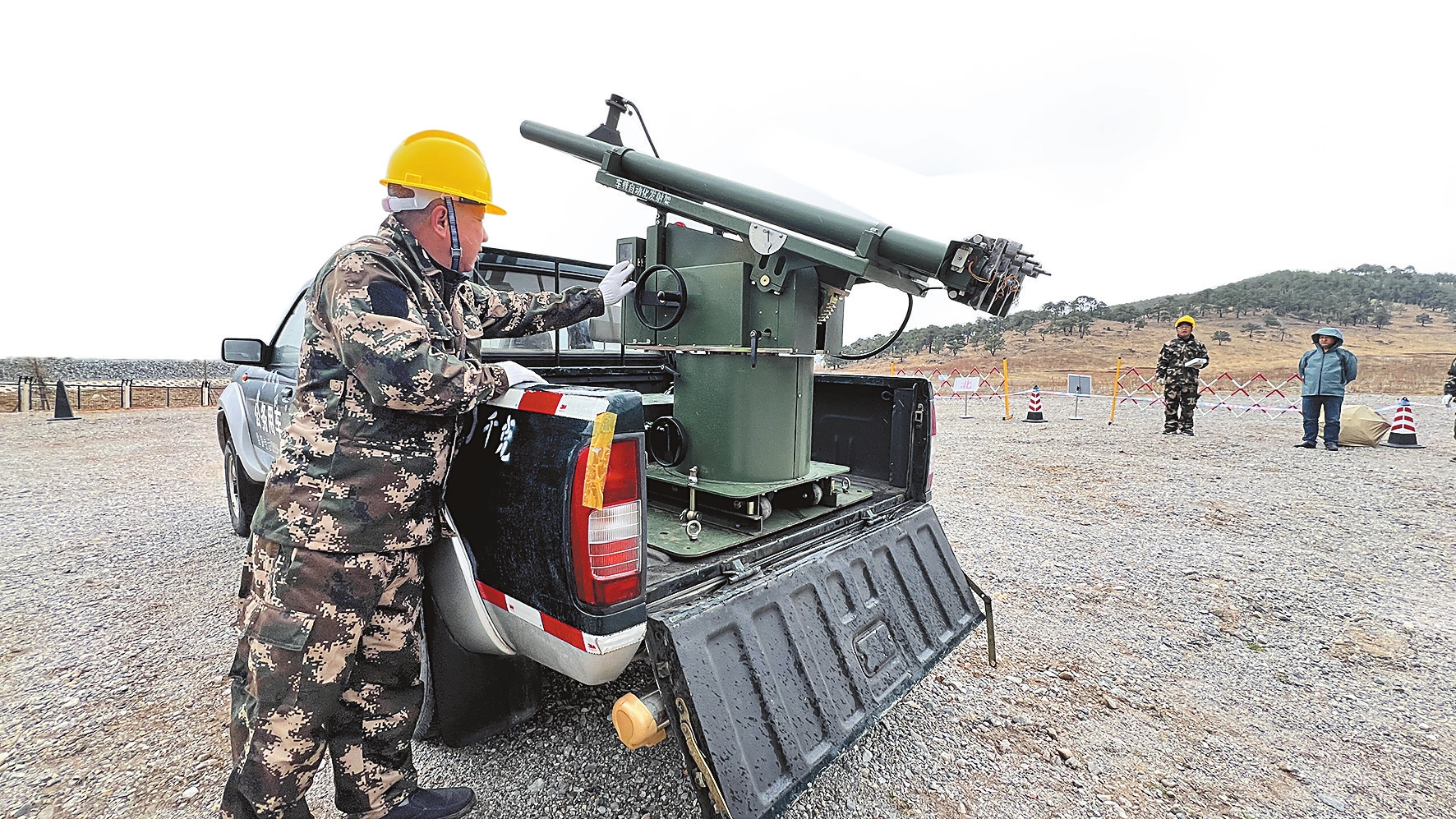3月22日上午11时,在丽江市玉龙雪山甘海子流动作业点的空地上,伴随着隆隆巨响,人工影响天气地面作业装置射出的炮弹冲上云霄,在空中划出一道道白色的轨迹。这是丽江市气象局人工影响天气作业人员在为玉龙雪山进行增雨(雪)作业。
