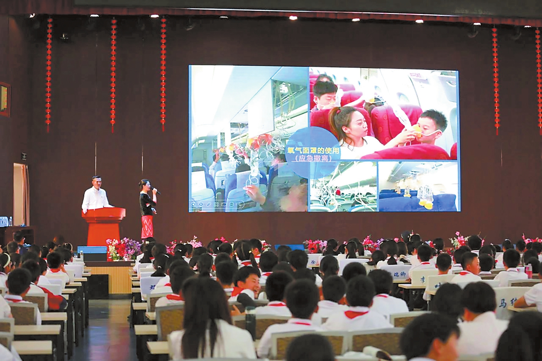 日前,一场别开生面的民航知识进校园活动走进云大附中星耀学校小学部。苏南瑞丽航空的飞机维修工程师、飞行员们为孩子们讲解了飞机维修、机场安全等知识,分享了驾驶舱里的故事,让孩子们在学习航空知识的同时,在心中种下翱翔蓝天的种子。本报记者 党晓培 通讯员 郭武辉 摄