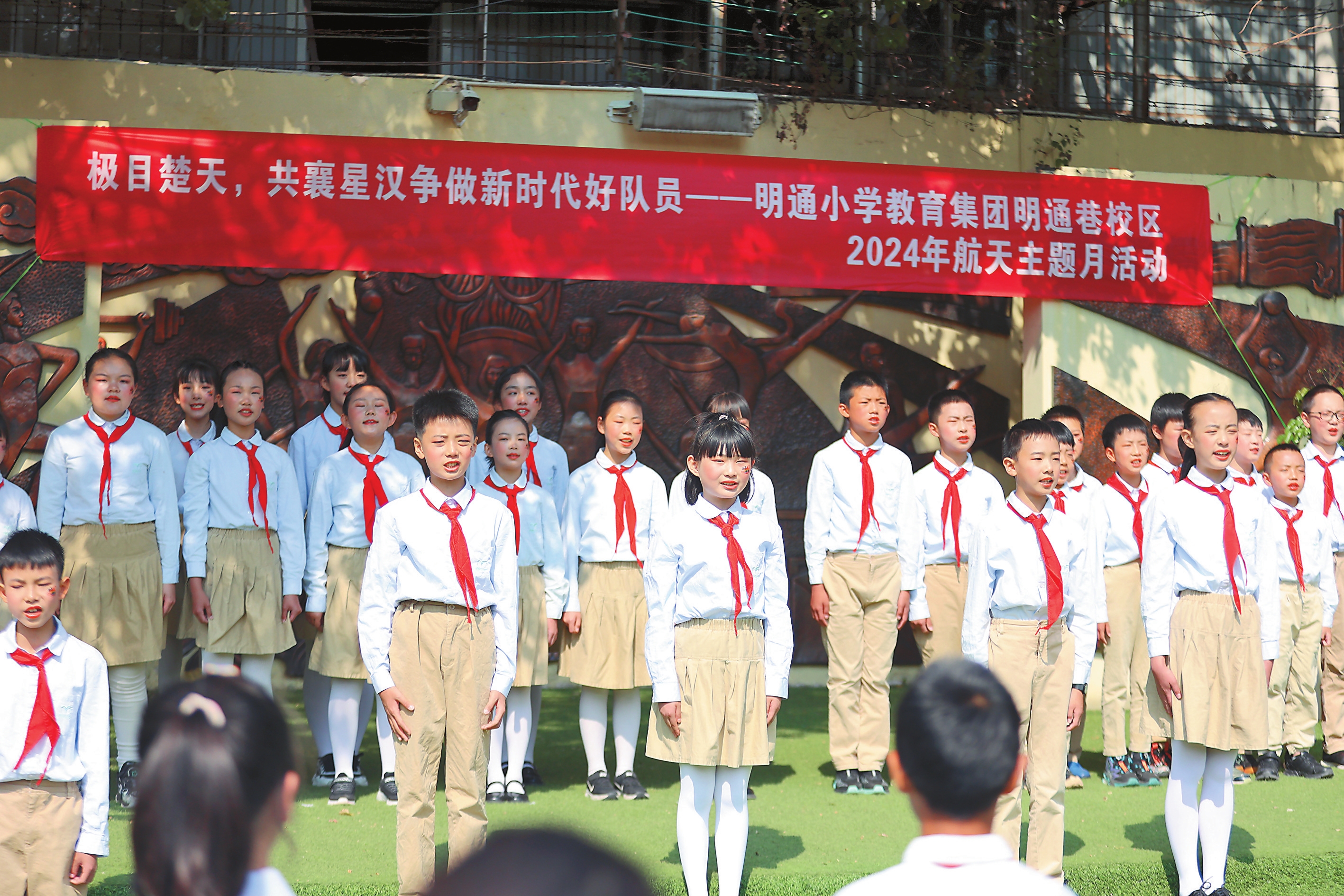 10时,“诗歌快闪”在长管和小提琴演奏声中拉开序幕。“铭记航天历史,传承飞天精神是强国一代的使命。壮志凌云,胸怀天下,是每一位中国少年的担当……”伴随着音乐的悠扬旋律,1500余名师生深情抒发对祖国航天事业的敬佩与赞美。