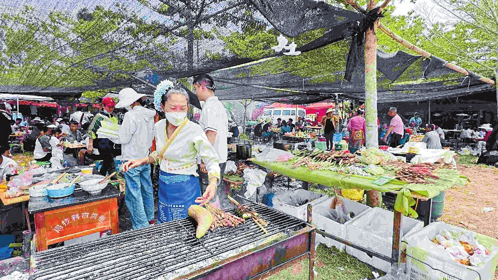 在村寨1000多米长的道路两旁,以民族文化展览、特色美食品尝、农特产品展销为主的“边陲露水街”,吸引着数千名宾客前来购物,整个村寨洋溢着浓浓的节日气氛。