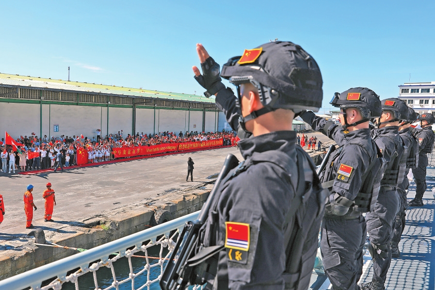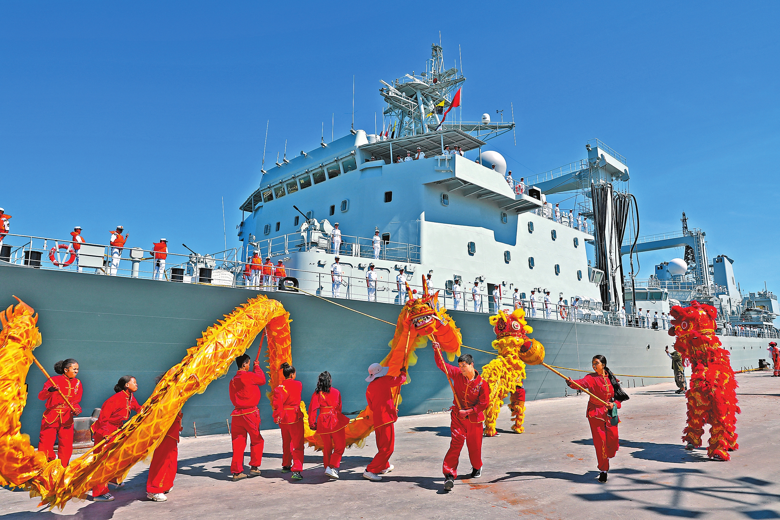 中国海军第45批护航编队10日抵达马达加斯加图阿马西纳港,开始为期5天的友好访问。图为4月10日,中国海军第45批护航编队抵达马达加斯加进行友好访问,欢迎仪式上马方组织舞龙、舞狮表演。 新华社发 王远方 摄