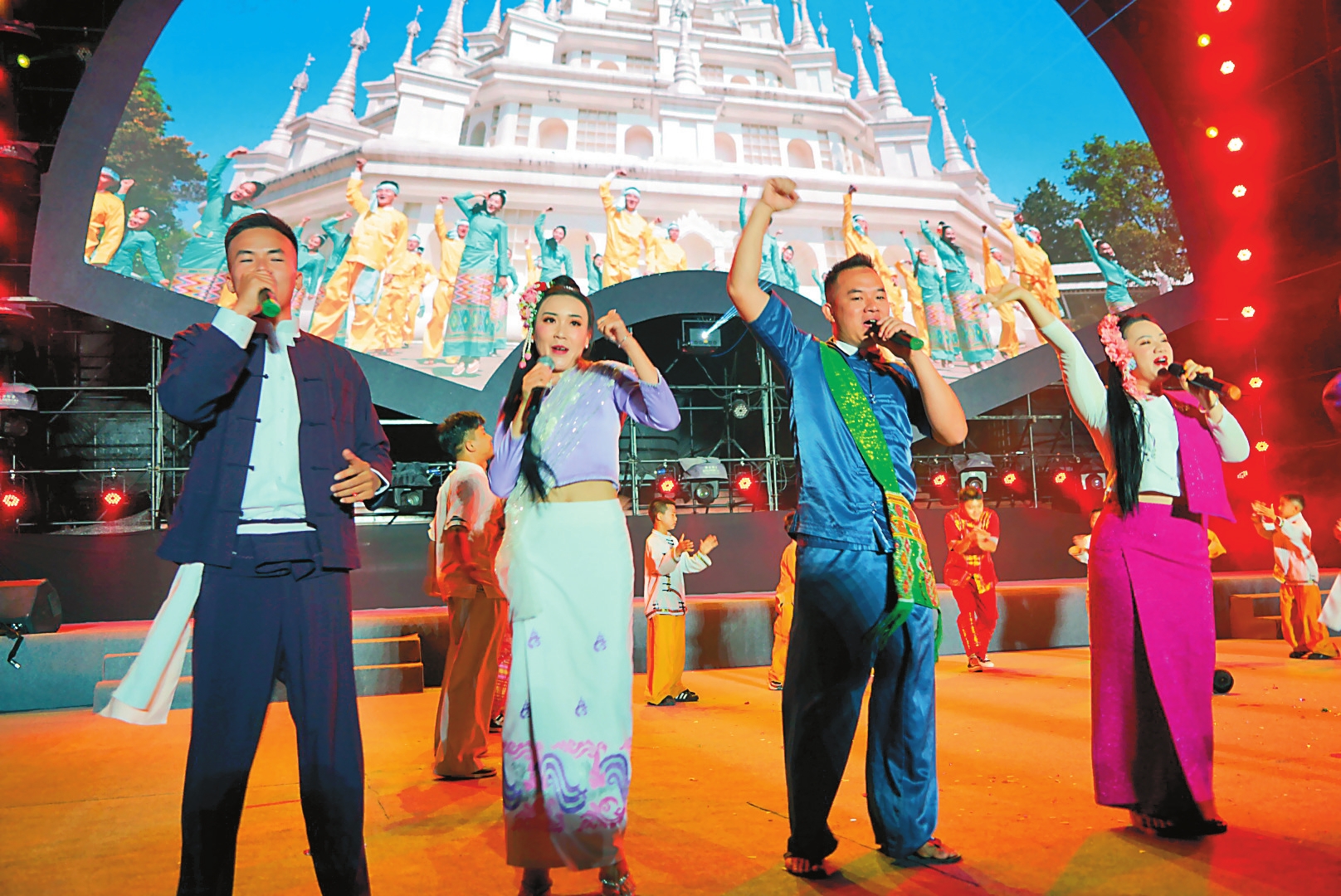 台上纵声放歌,台下互动火热。“有一个美丽的地方”德宏专场暨芒市2024年泼水狂欢节“样样好”音乐篝火晚会为观众带来一场民族音乐与现代音乐相融合的文化盛宴。晚会分3个章节,分别为“样样好德宏 喜洋洋芒市”“爱在德宏 相约芒市”“幸福德宏 网红芒市”,约4万名观众参与。