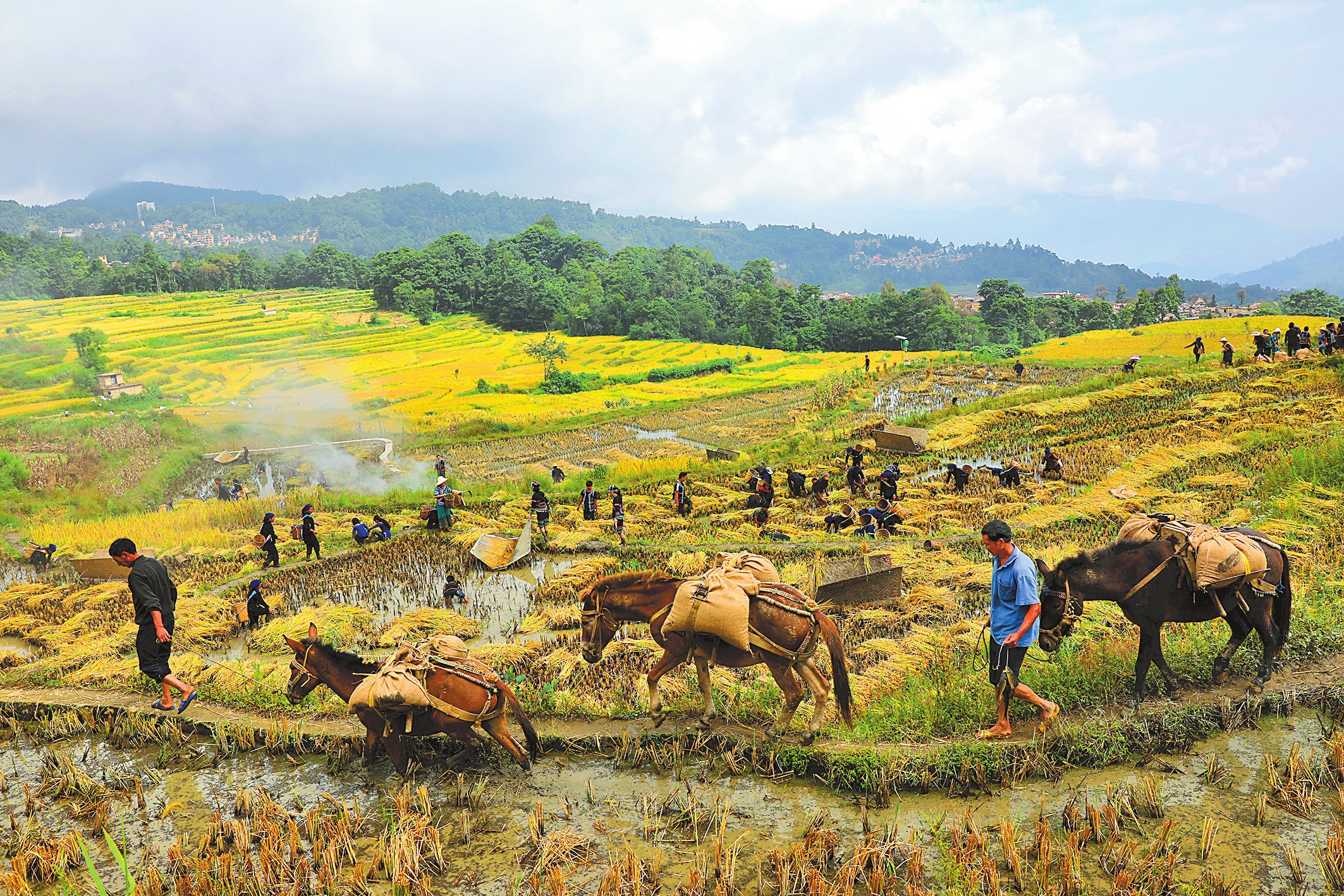 2023年,元阳梯田红米迎来丰收。稻渔共作模式下,全县红米产量近4万吨、稻田养鱼总产量3606吨,稻田综合亩产值由不足3000元提高至10000元左右。 本报通讯员 张正亮 摄