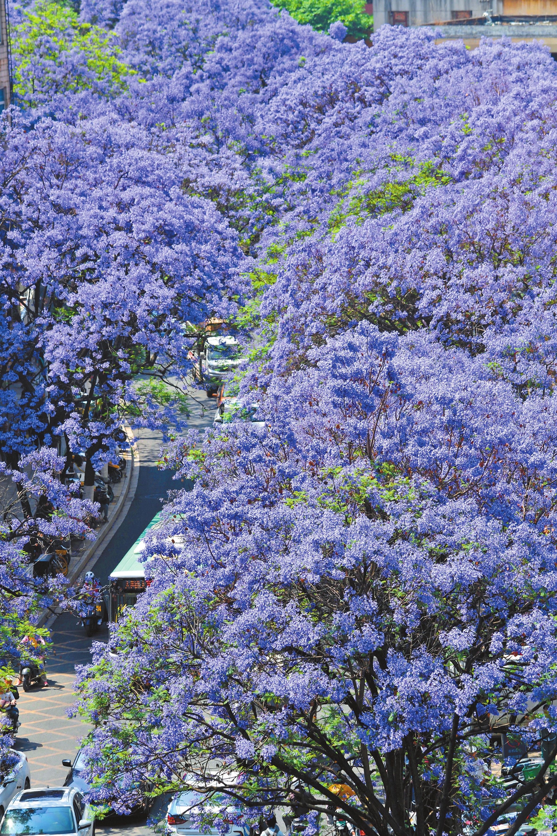 1984年,蓝花楹首次由中国科学院昆明植物研究所从阿尔及利亚引进昆明,开启春城花事的另一种颜色。每年4月底至5月初,一公里多长的教场中路两旁,串串蓝紫色花朵竞相怒放,观者如云。