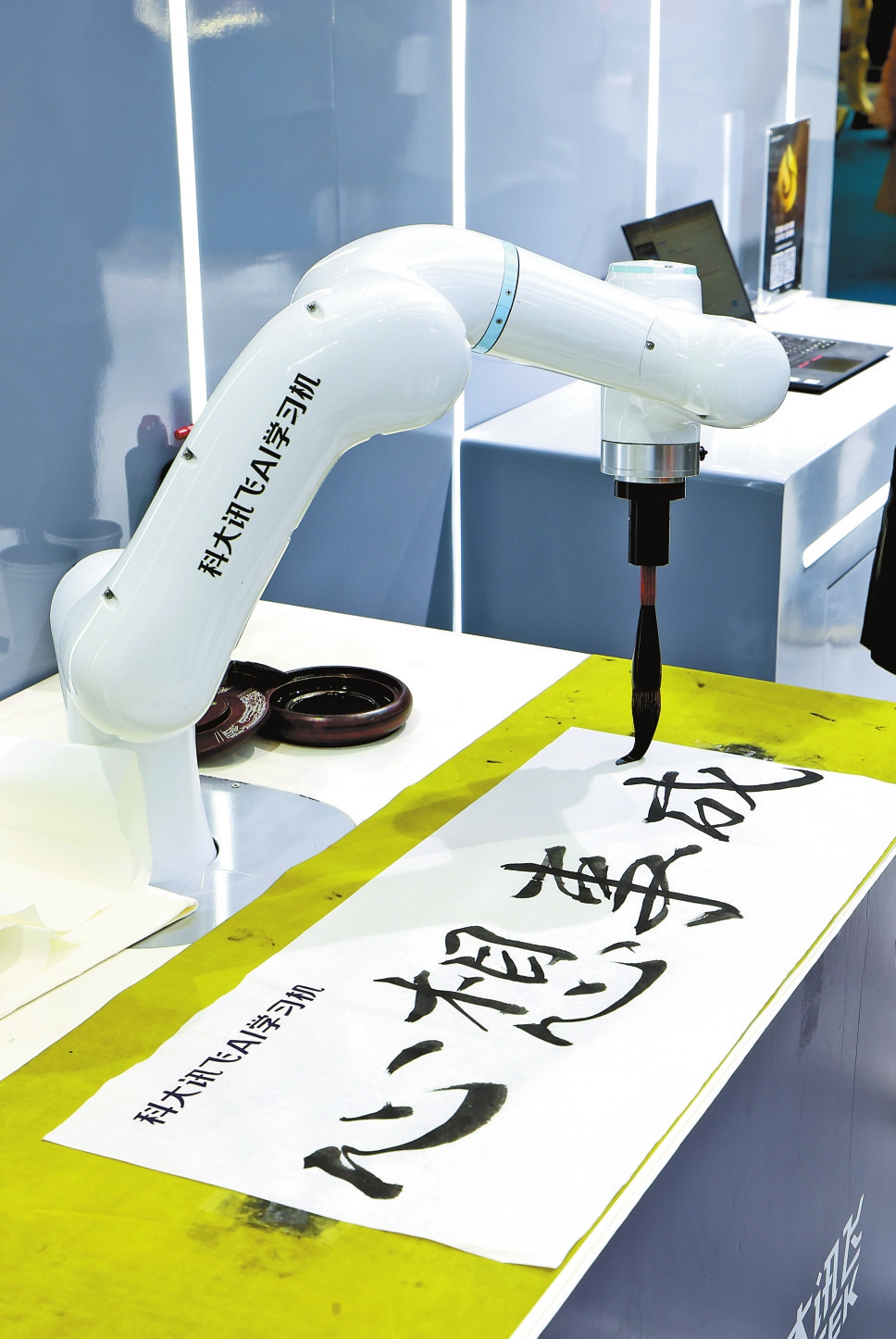 在科大讯飞展台,AI书法机器人在现场“挥毫泼墨”。