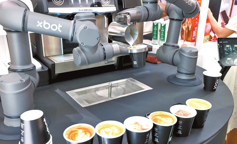 在王府井集团展台,xbot拉花咖啡机器人为参观者制作咖啡。