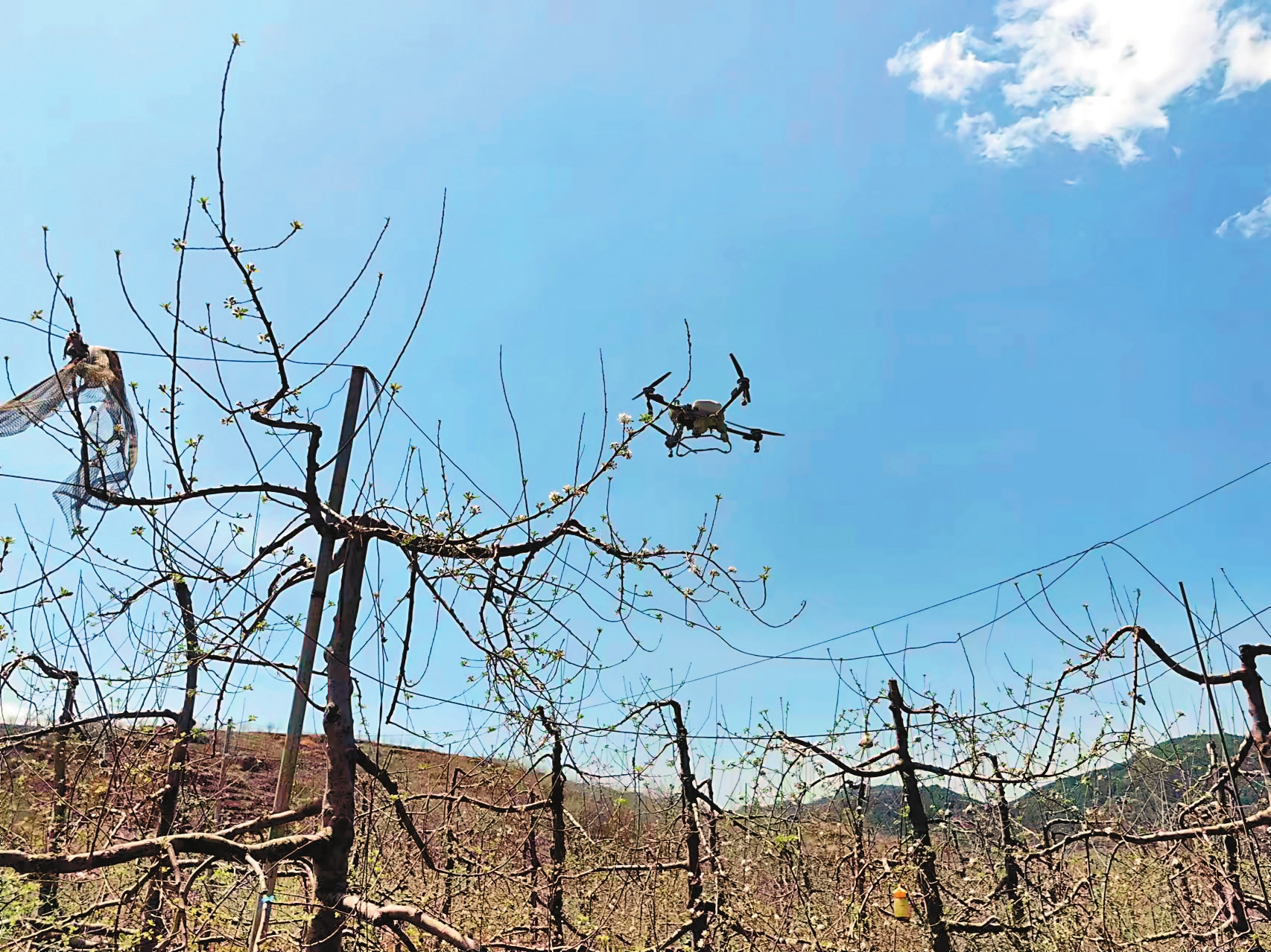 试验中,工作人员将苹果花粉融在喷施器的水中,再由植保无人机带到苹果树上空,利用无人机自身的风力将花粉喷洒到花朵表面,实现授粉。