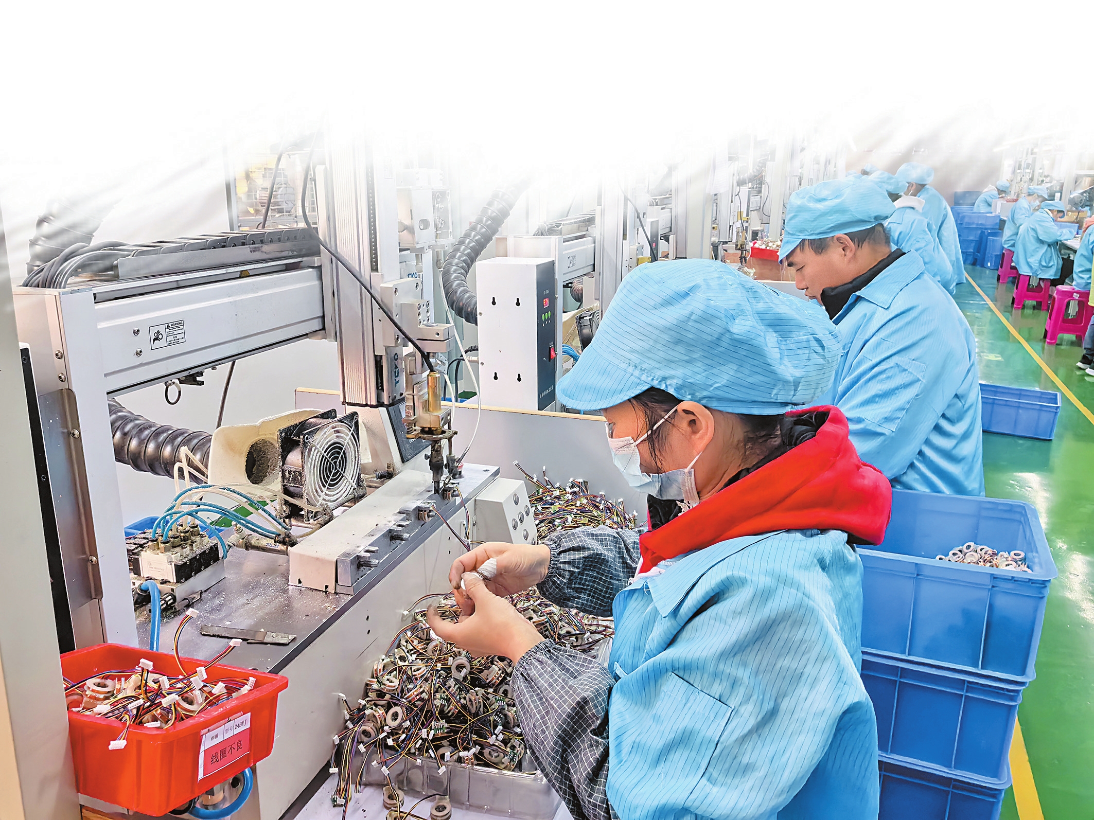 盛之发机电会泽有限公司的生产车间内工人们正在组装零部件。