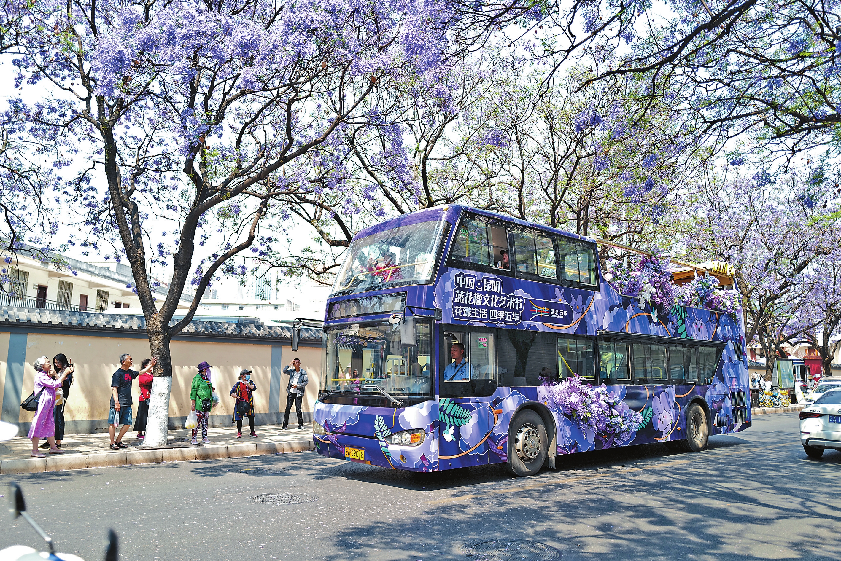 连日来,昆明市教场中路数百棵蓝花楹盛开,将街道装点为充满紫色浪漫的网红打卡点,吸引游客纷至沓来,赏花拍照、逛街休闲,体验“花漾生活”。图为游客乘坐蓝花楹赏花巴士欣赏街景。本报记者 杨峥 陈飞 实习生 门世辉 摄