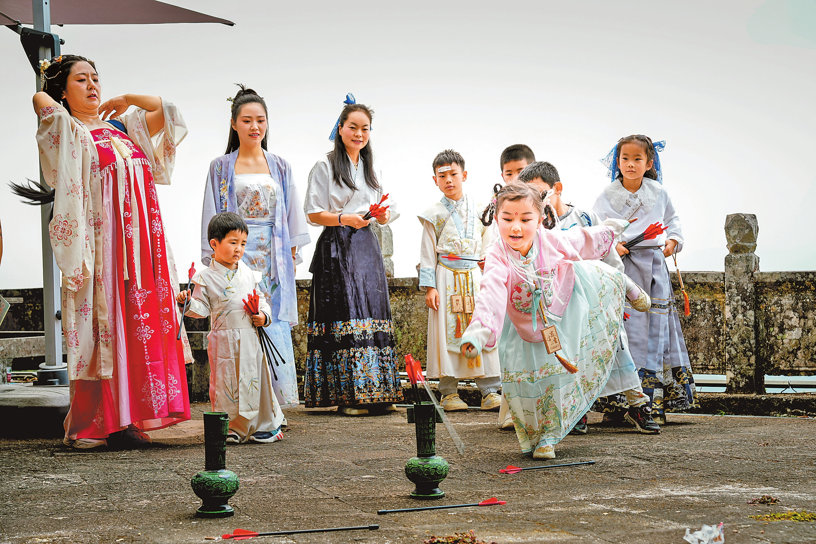 本次活动共309人参与,其中登山健身组204人、汉服徒步组105人。当天中午,两支队伍在宝峰寺会合,参与投壶与射弩体验项目,领取活动证书,部分参与者打卡“云岭百峰”获得电子证书。