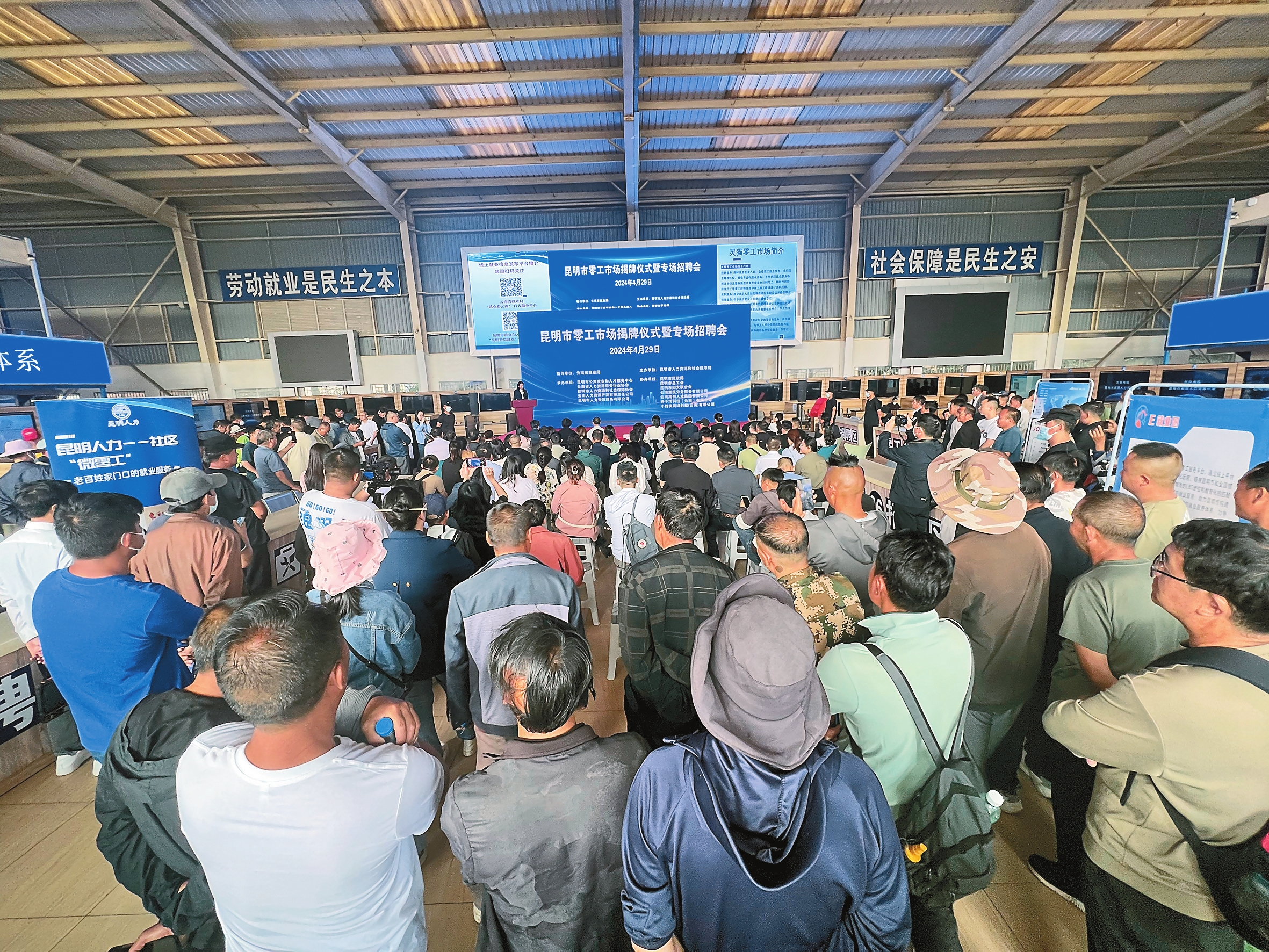 昆明市零工市场内设立了零工招聘区、零工信息发布区、零工驿站,装配智慧就业自助服务机、LED大屏幕、液晶电视、服务流程展板,构建了集岗位信息发布、就业创业指导、政策咨询、便民休憩等功能于一体的综合性服务场所,同时还配备行李存放、卫生间、充电等生活服务设施,为求职者和招聘企业“搭平台、建桥梁”,让服务更有温度、保障更有力度、对接更有速度。
