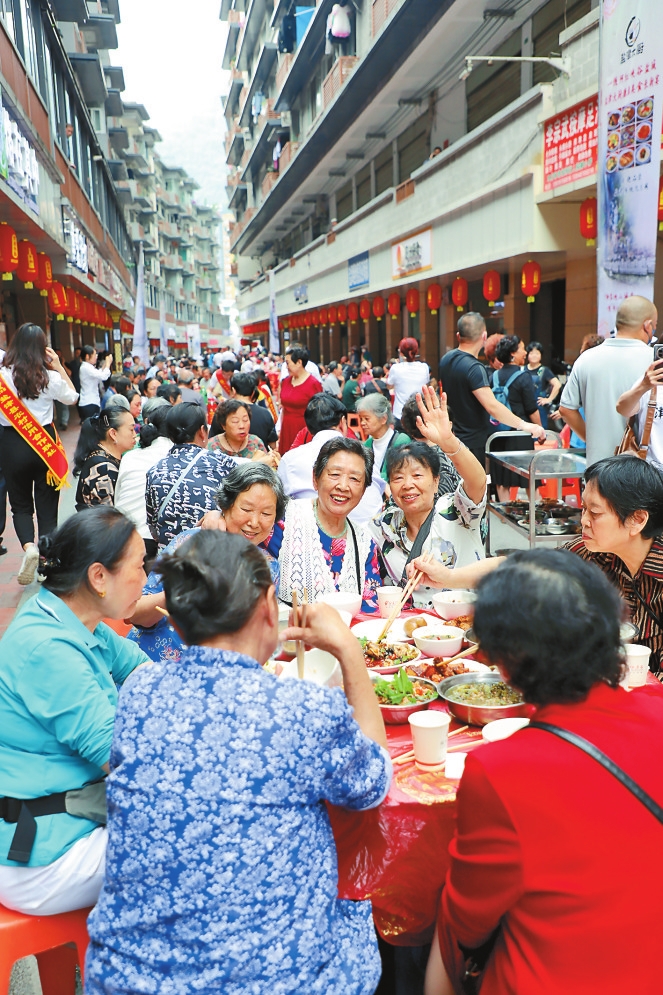 200张圆桌一字排开,远远望去犹如一条长龙。宴席上,由蛋圆子、粉蒸肉、椒麻鸡、石磨豆花、酥肉、红烧肉、家常鱼、酸菜米豆汤等菜肴组成的盐津“九大碗”依次上桌,香气四溢。